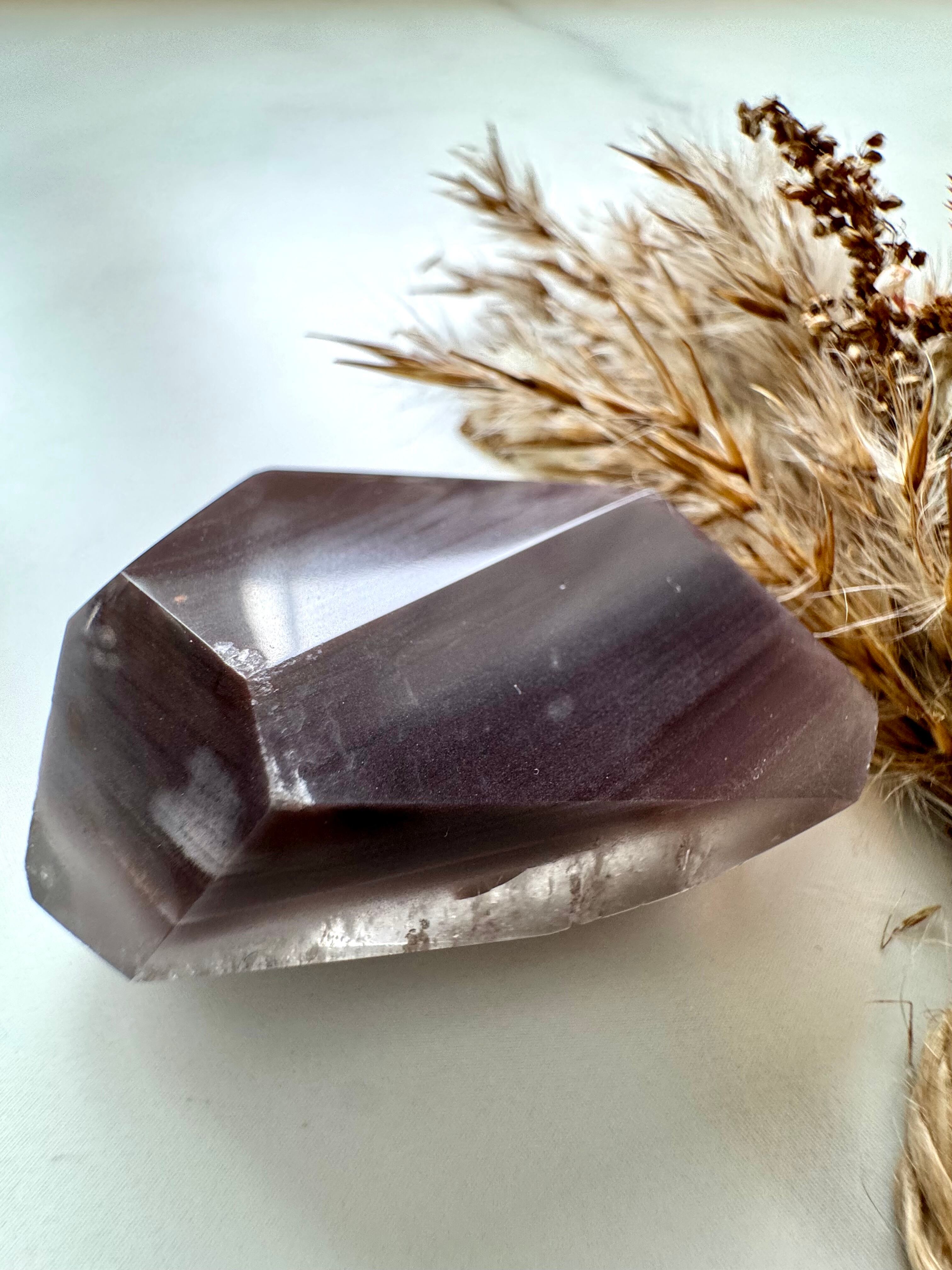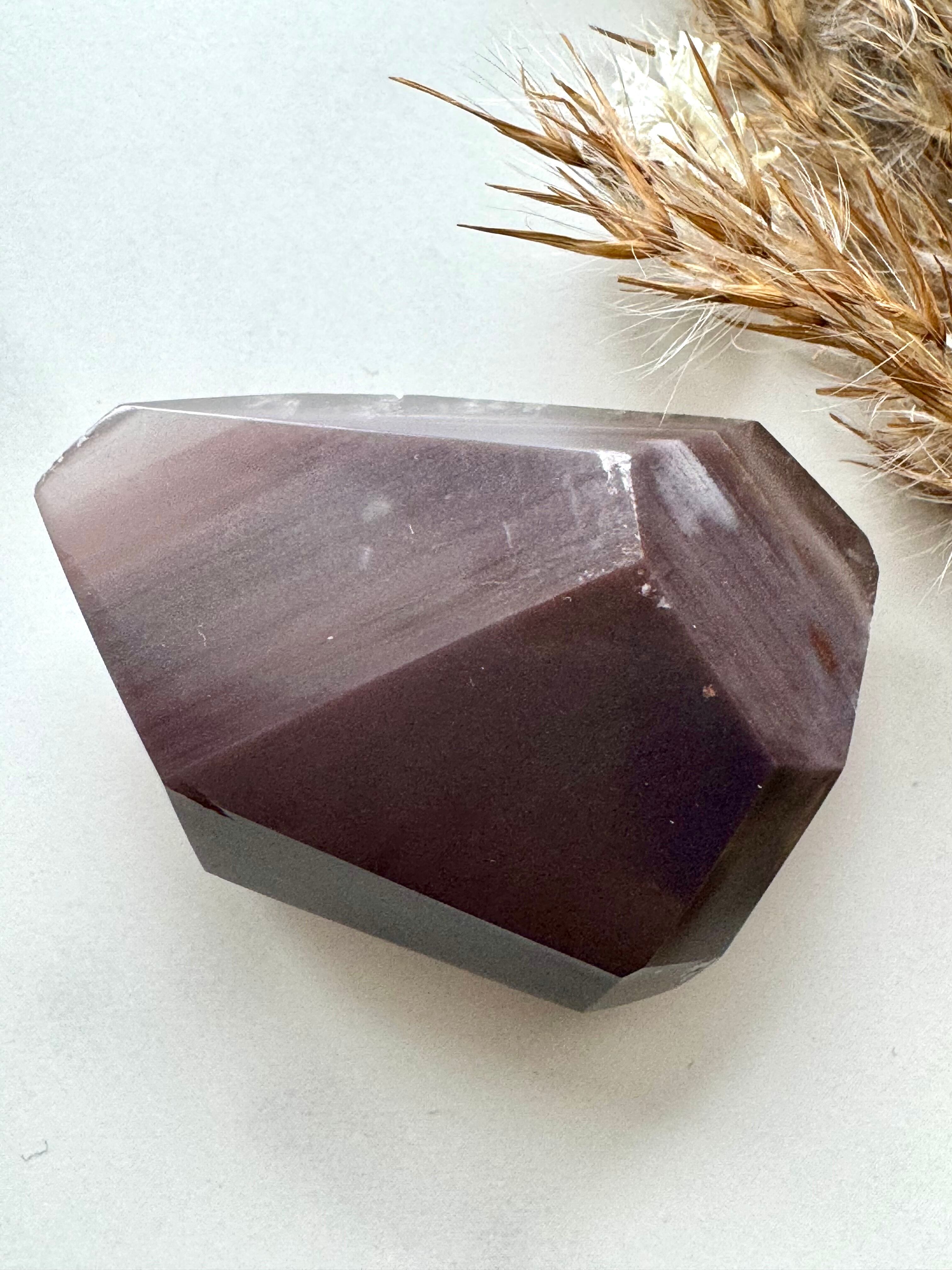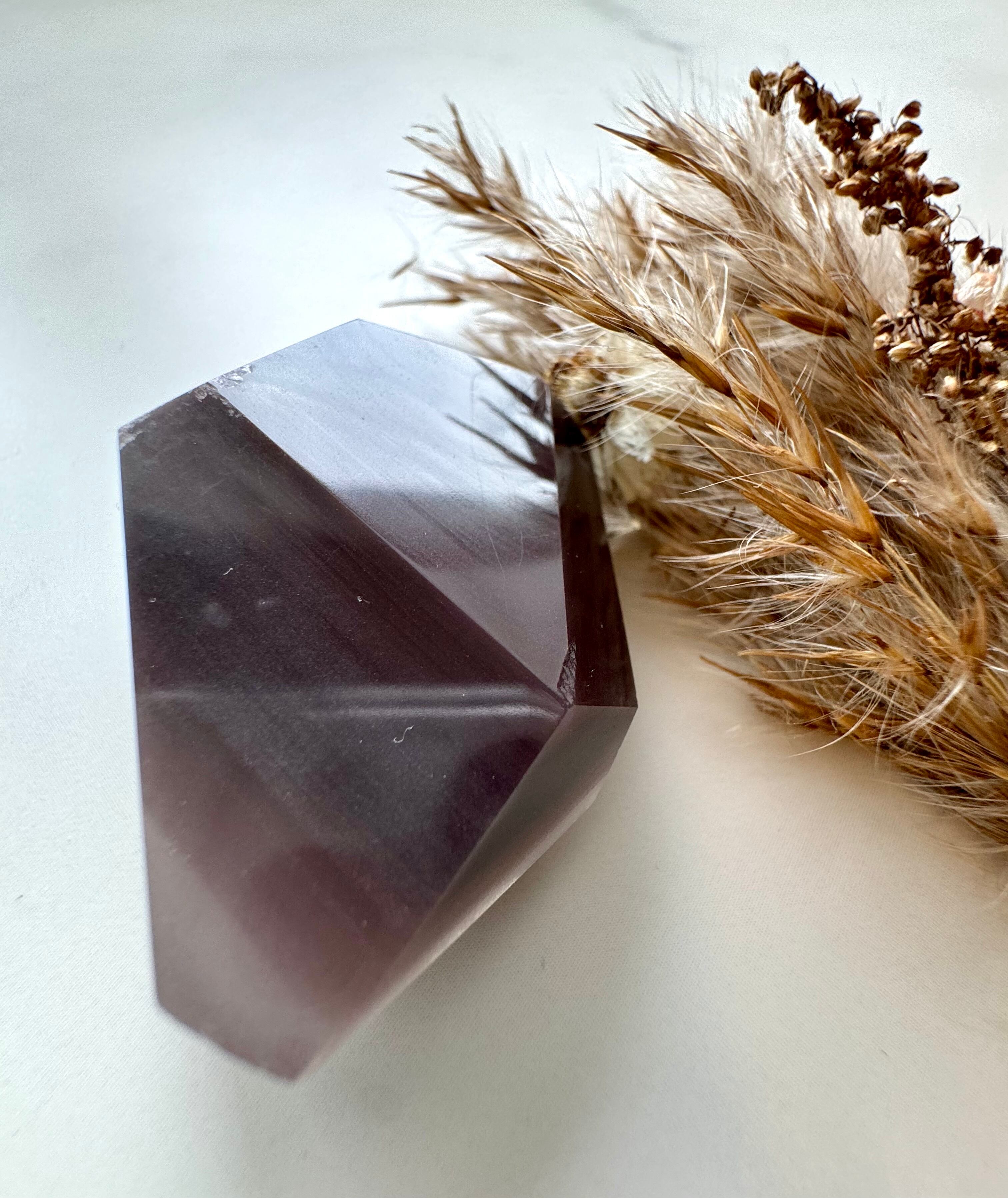 深いパープルがとても穏やかな気持ちにさせてくれるリチウムクォーツのフリーフォームです。綺麗な虹も見られます。平らな部分を下に立たせて飾る事も出来ます。