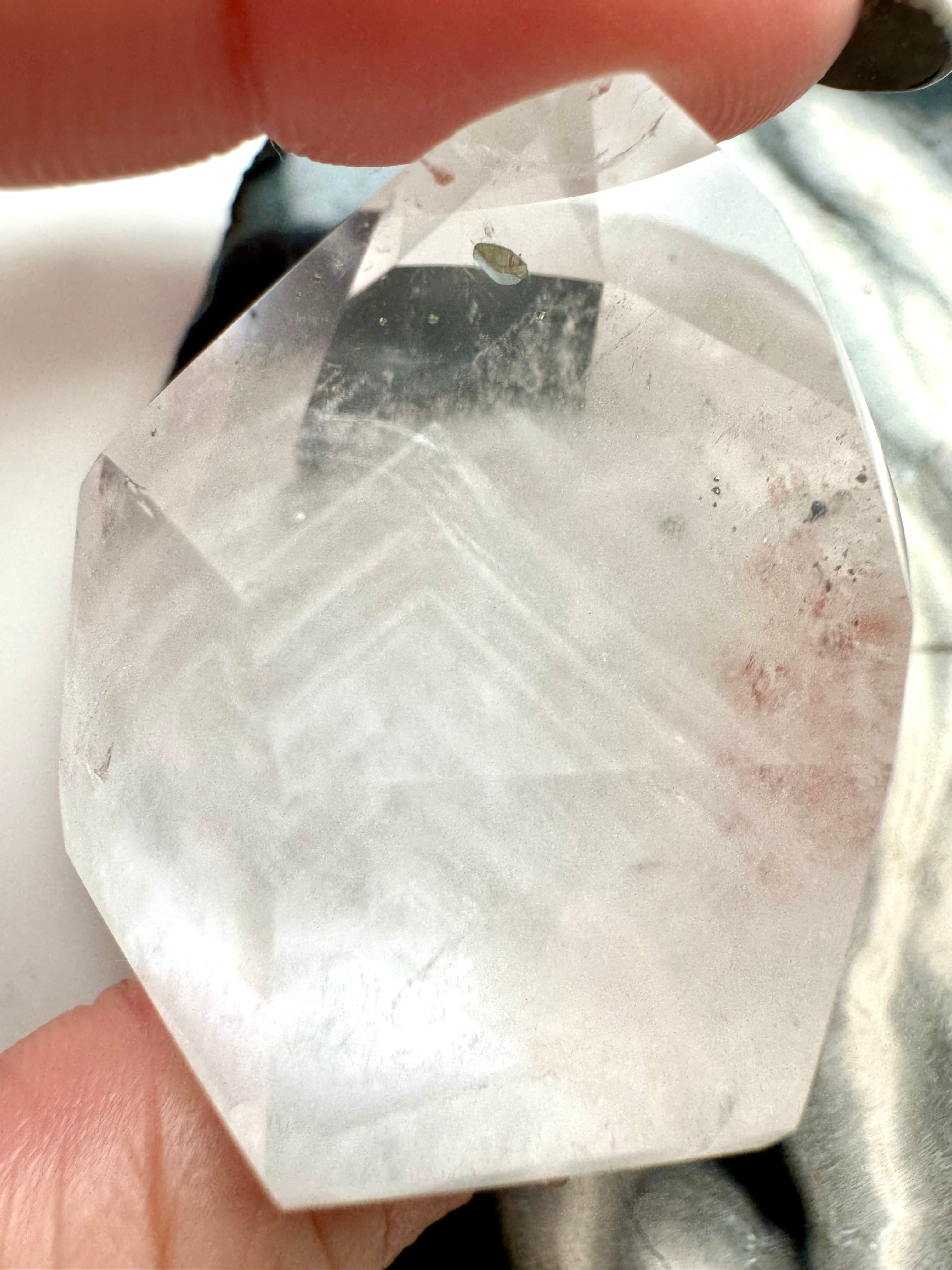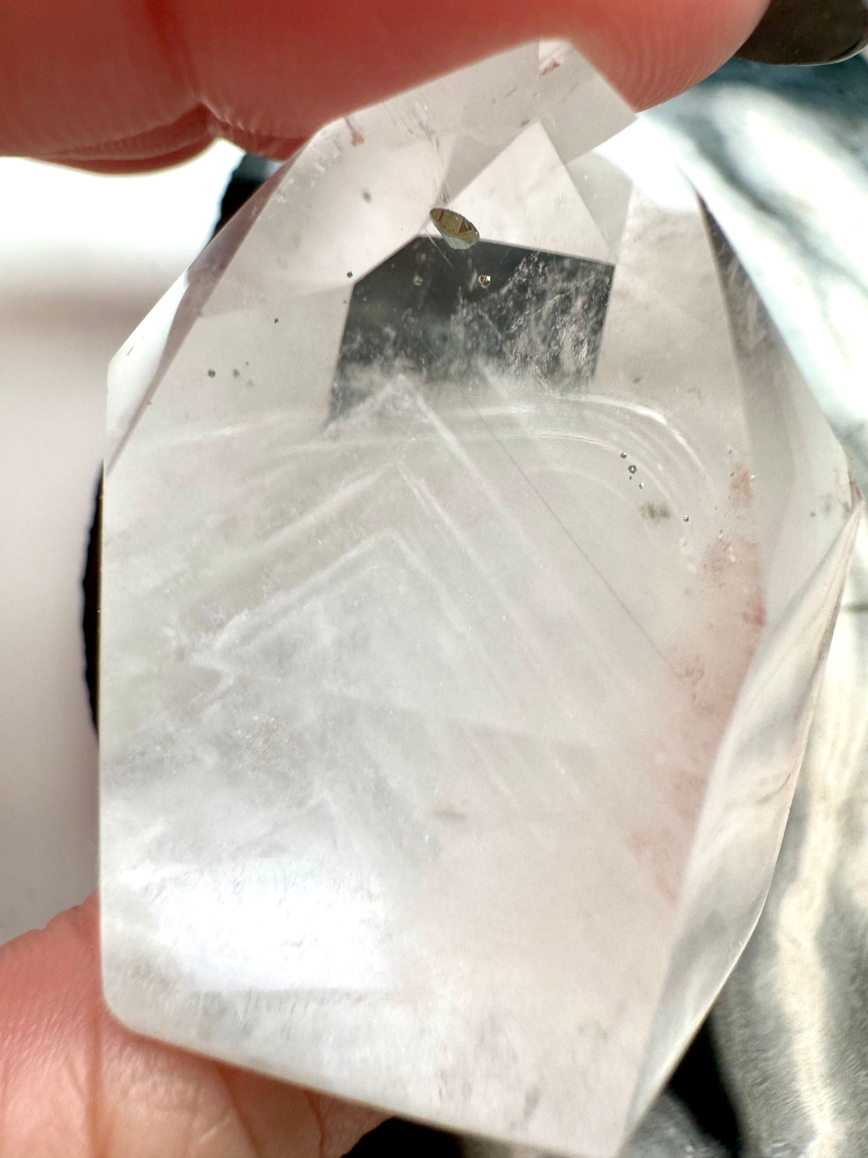 透明度の高いクォーツから見える幾重ものホワイトファントムとパイライトのファントムクォーツです。まるで雪山の様な白い山々が、静寂で洗練された世界を連想させる幻想的なポイントです。