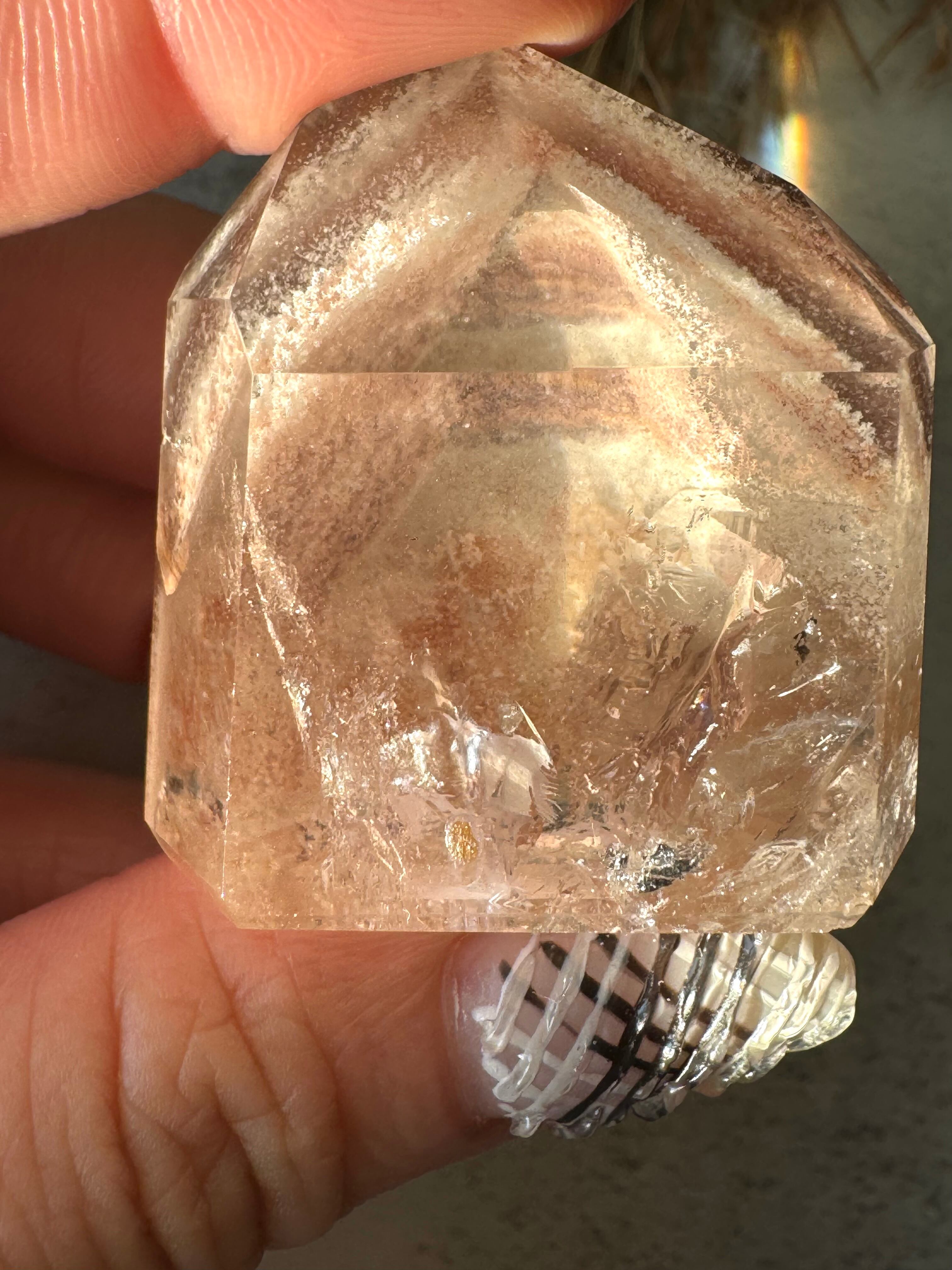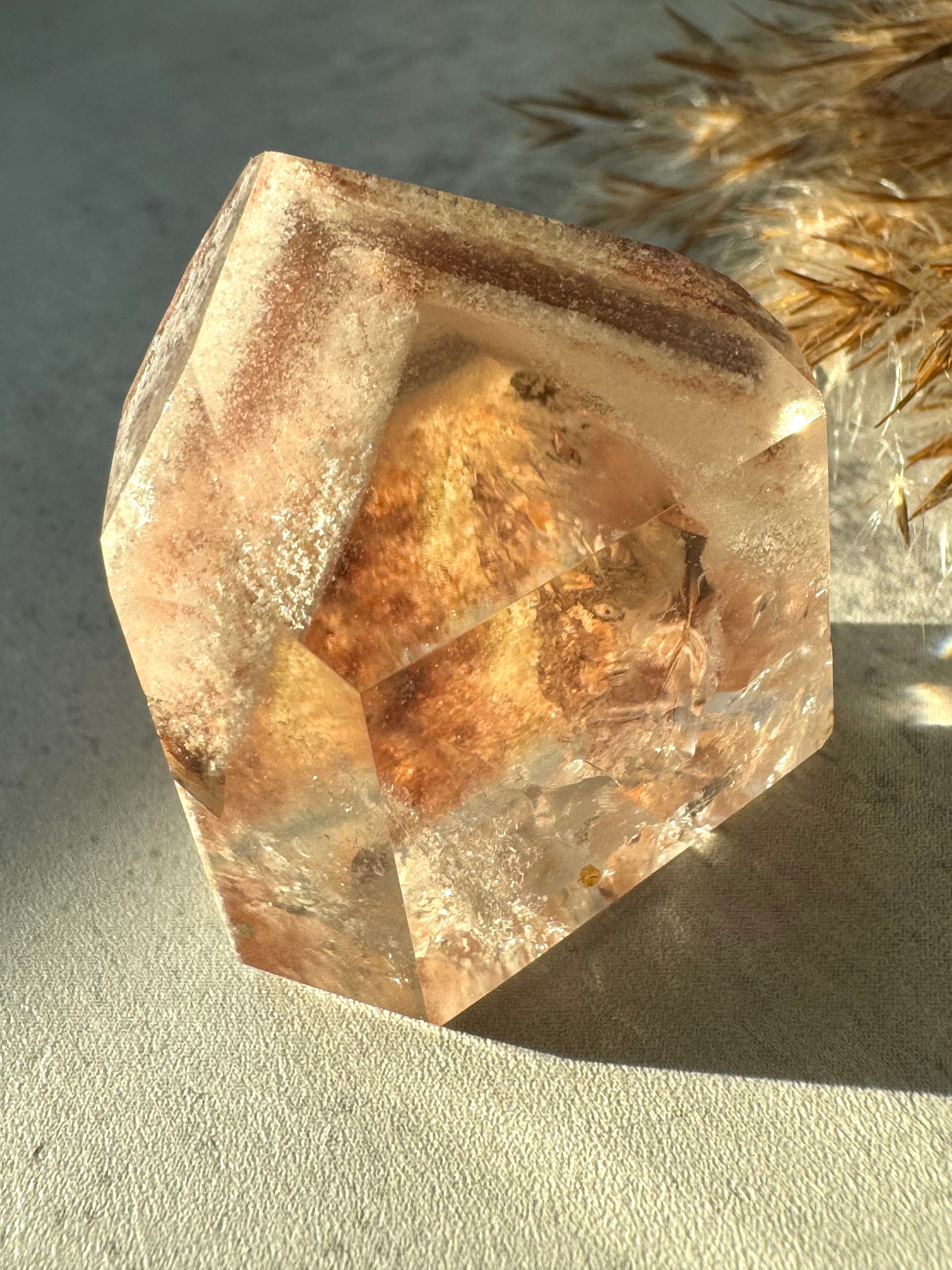 とても透明な水晶の中に、優しいピンクのガーデンが幻想的なフリーフォームです。