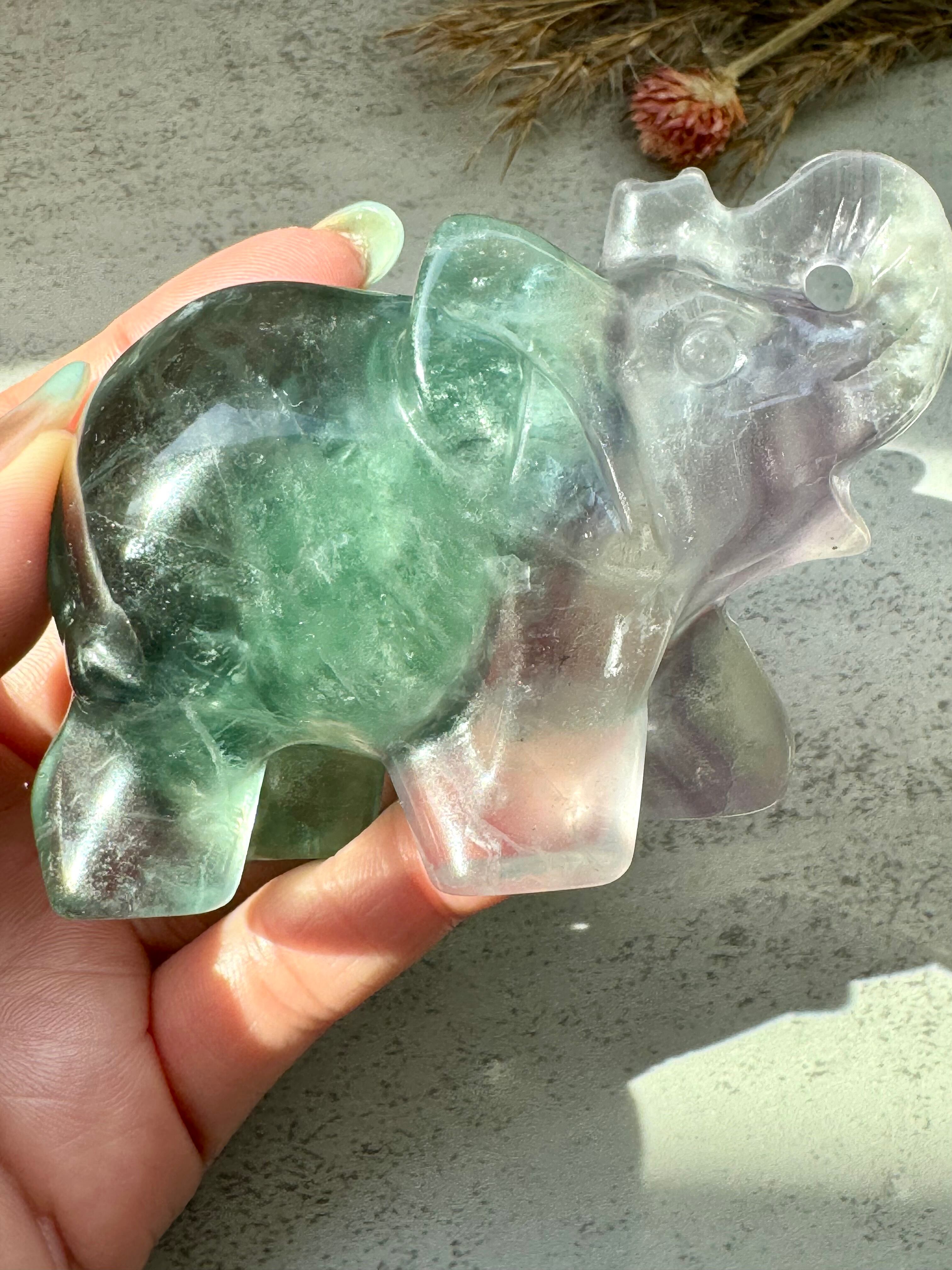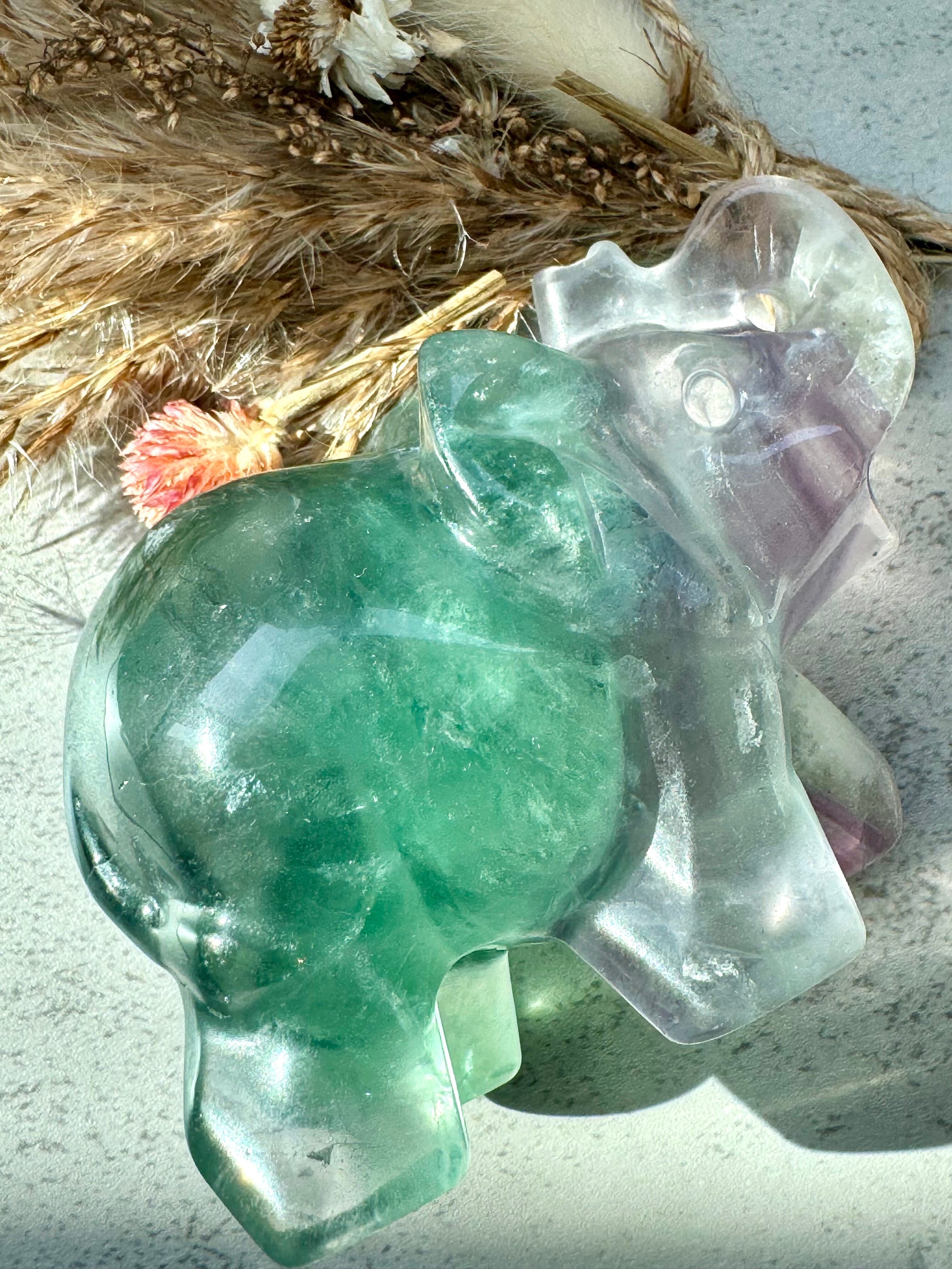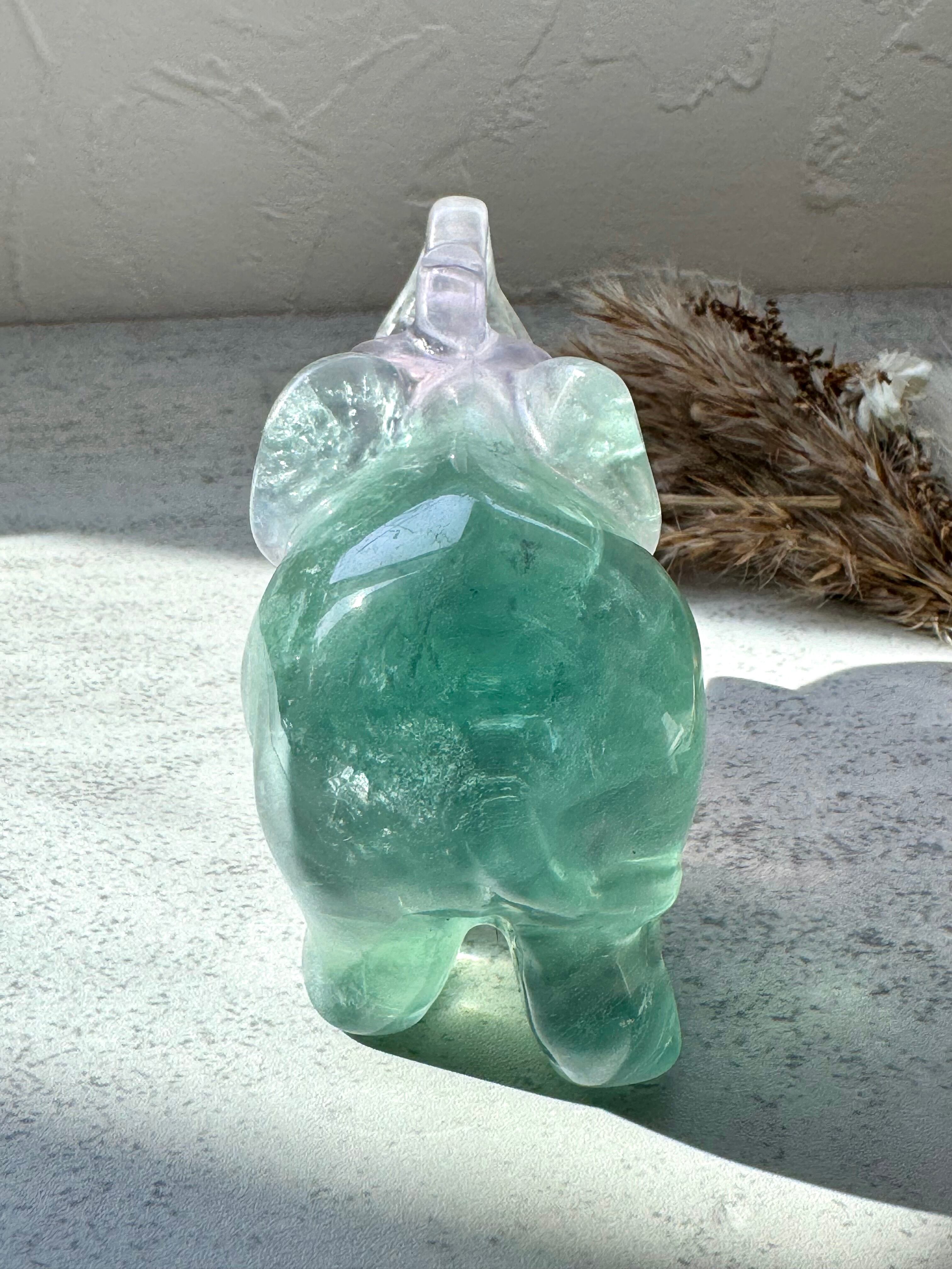 透明度の高いグリーンとパープルが美しいフローライトのエレファントです。透明感が素敵な象です。