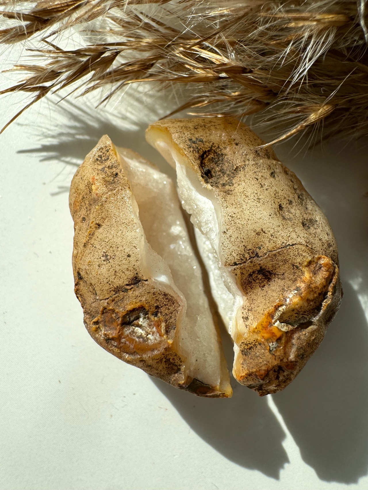外見と中身のギャップが魅力的なジオードペアです。見た目はポテト、中身は繊細でキラキラのジオードが素敵です。