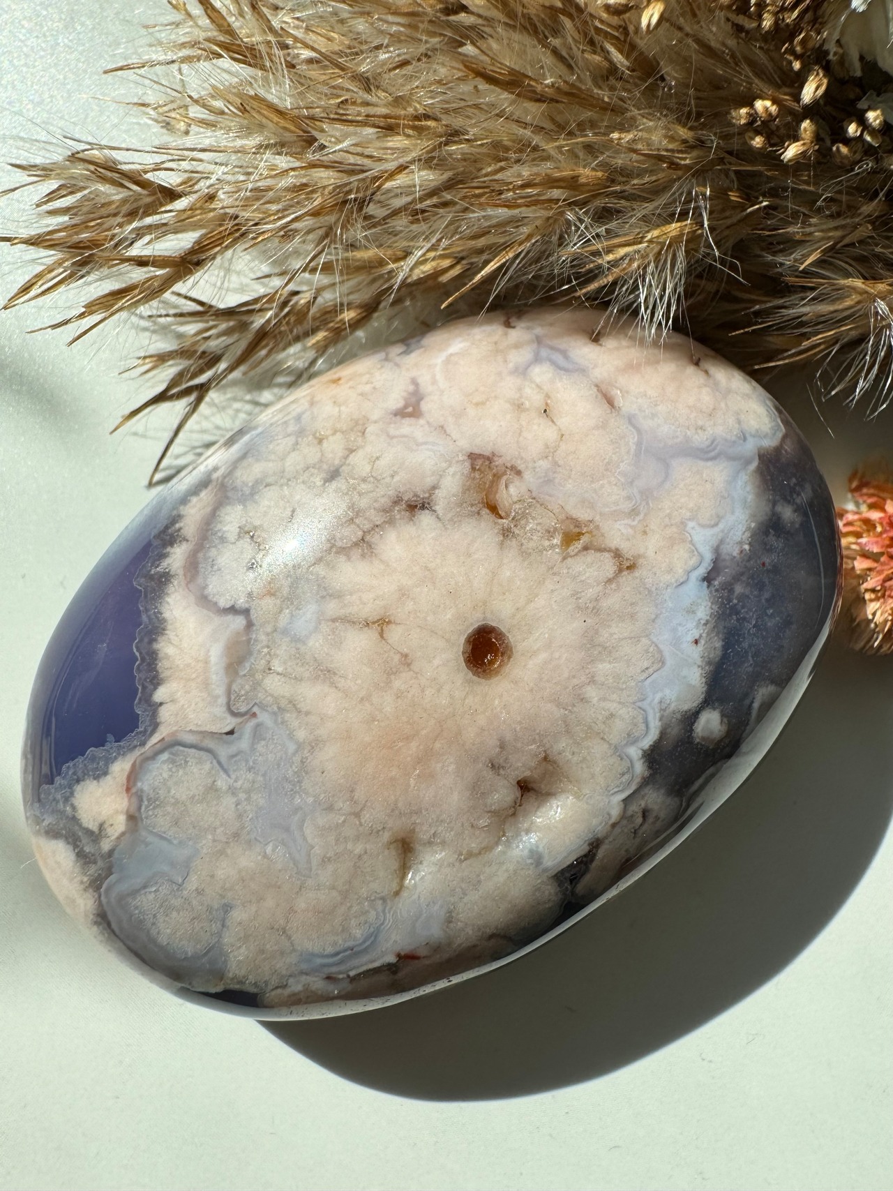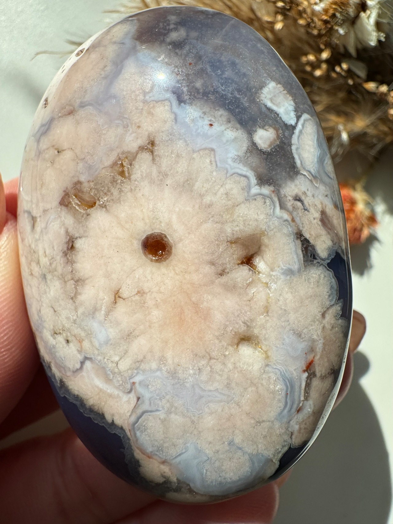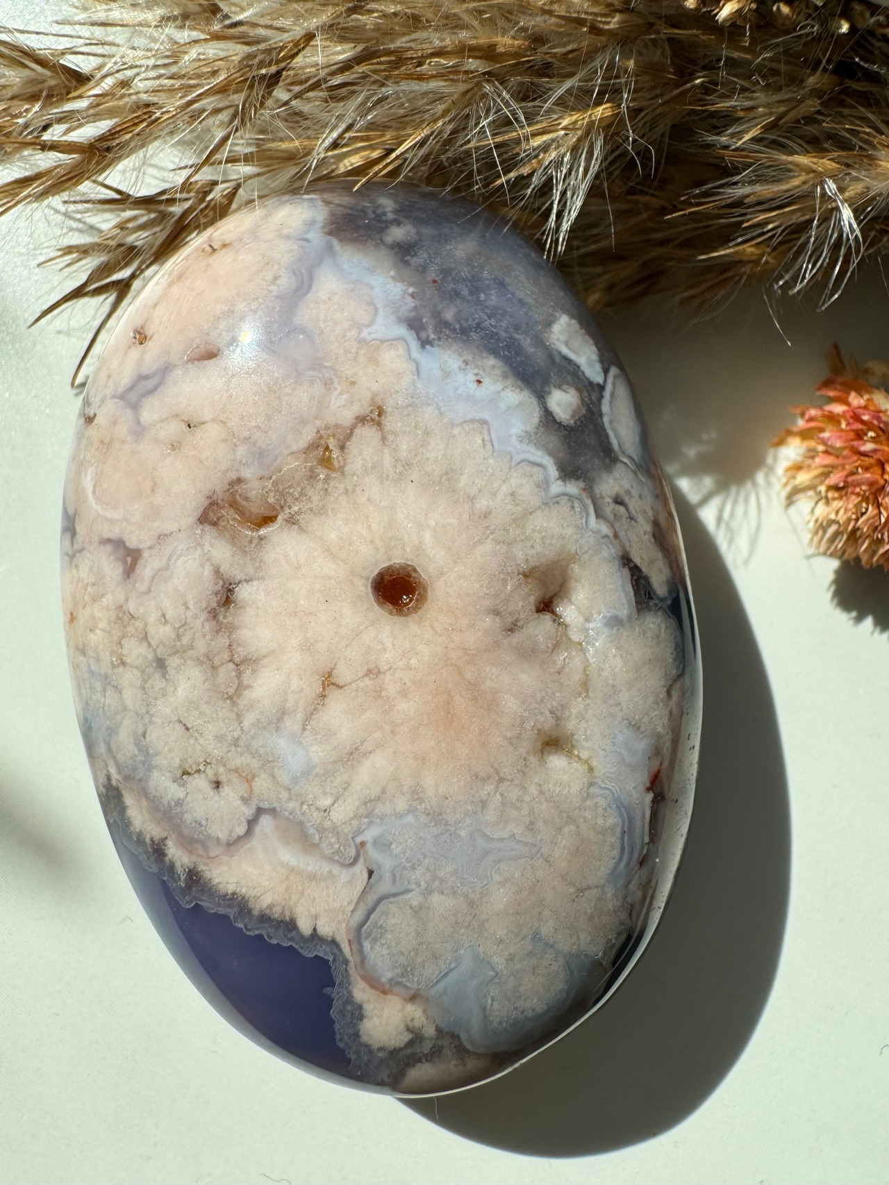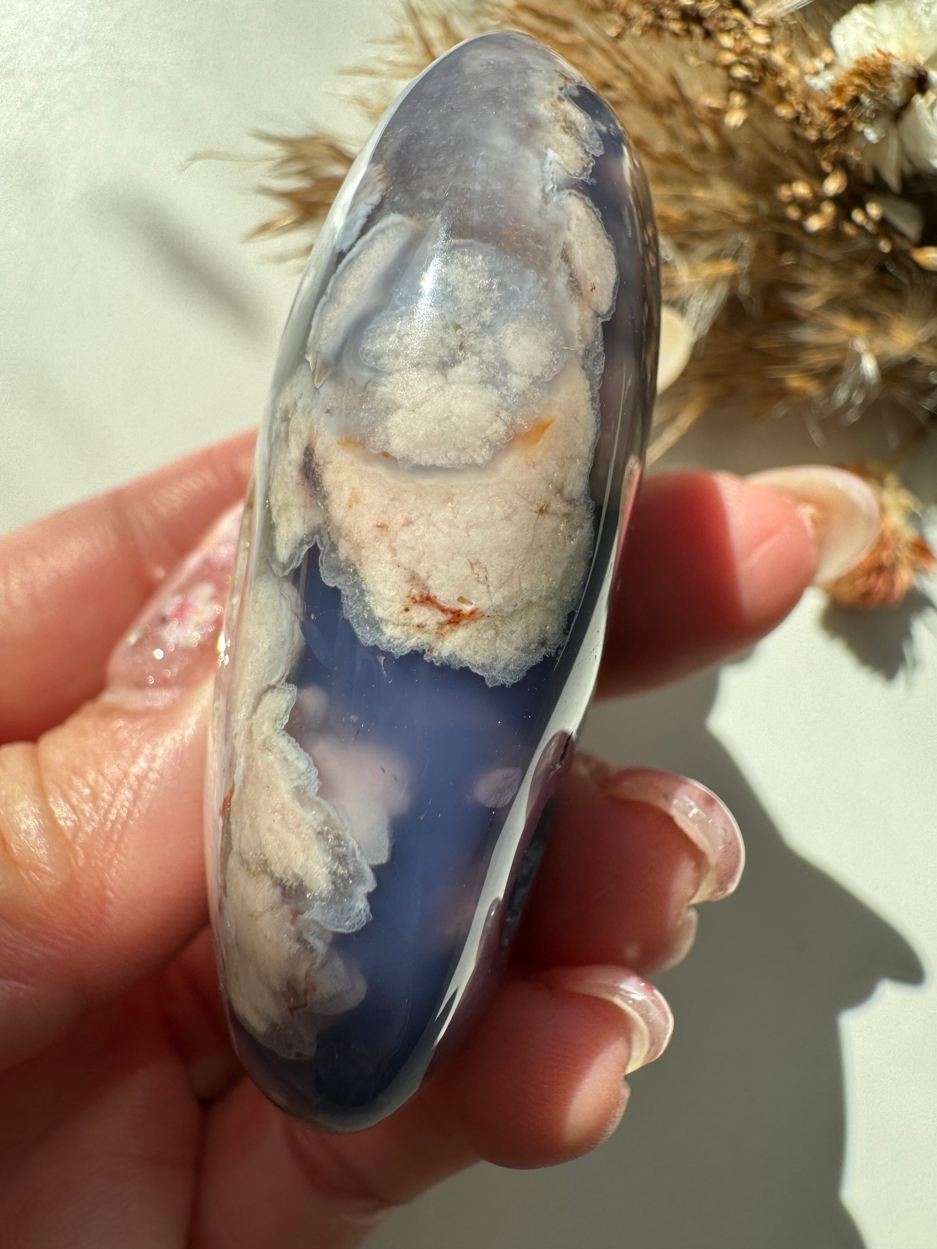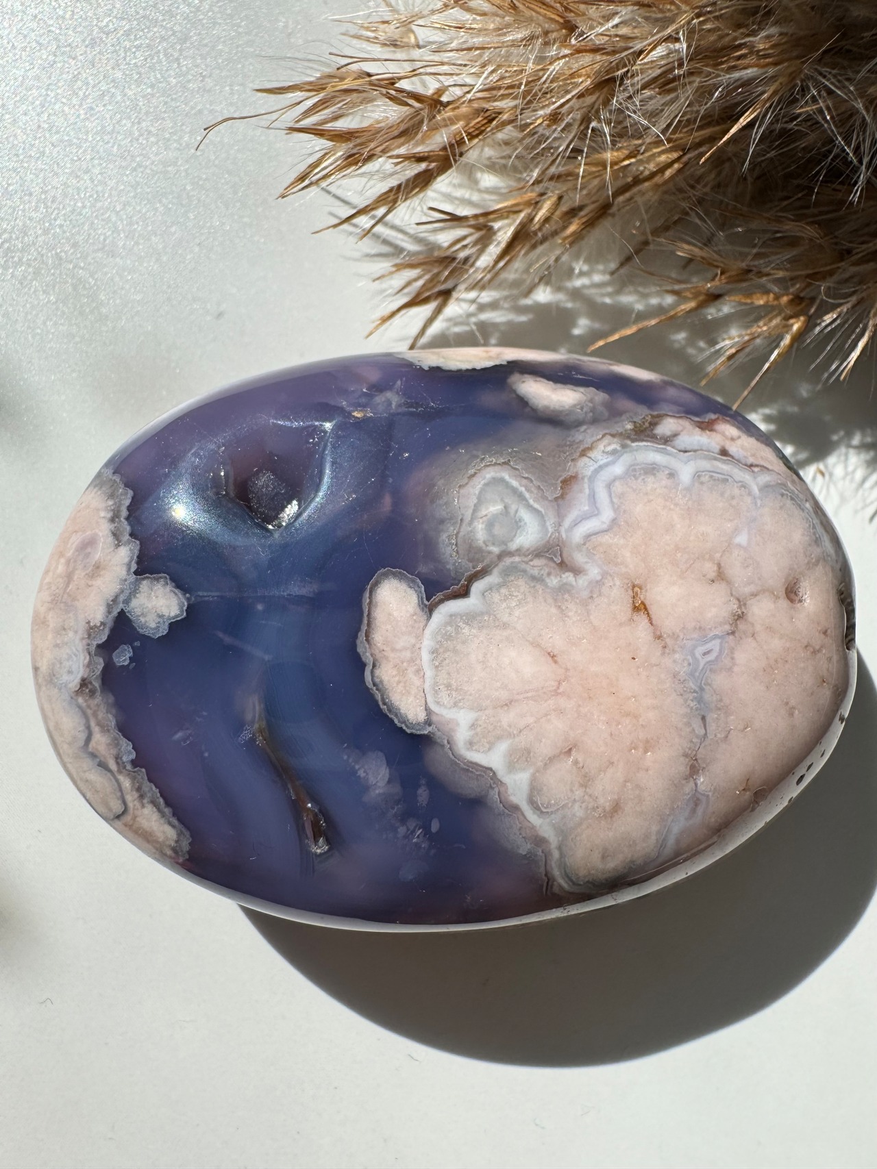 青色の石に薄ピンク色のお花が咲いている、とっても可愛らしいブルーフラワーアゲートパームストーンです。