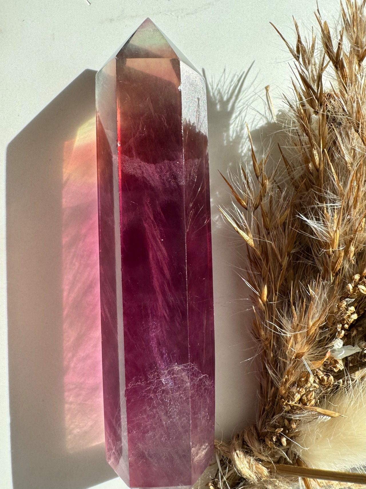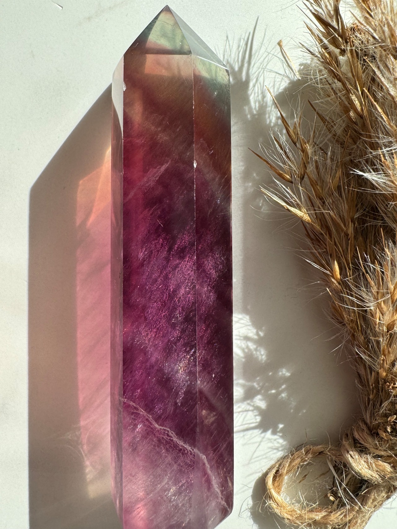透明度の高いグリーンとパープルが美しいフローライトのタワーです。