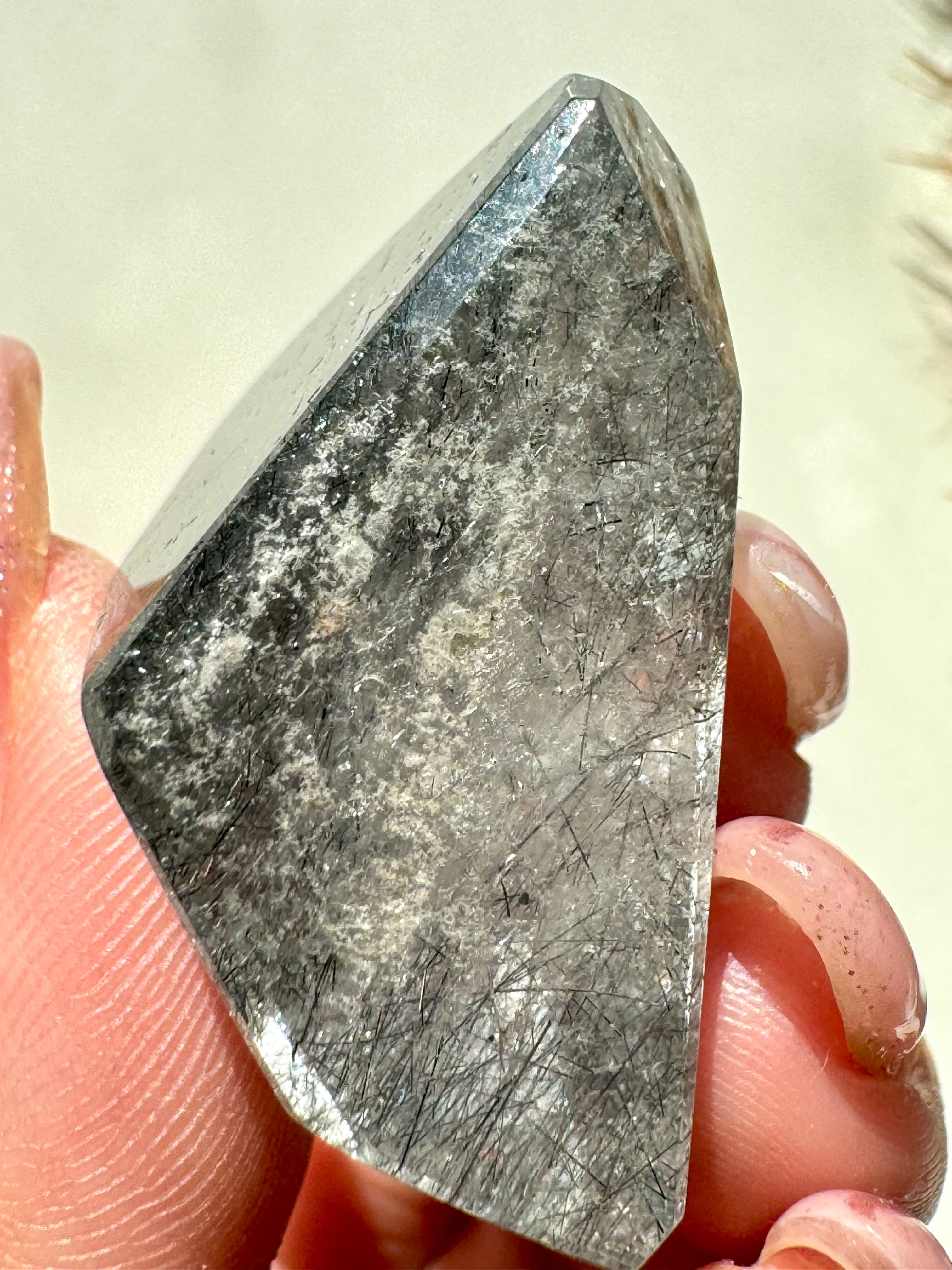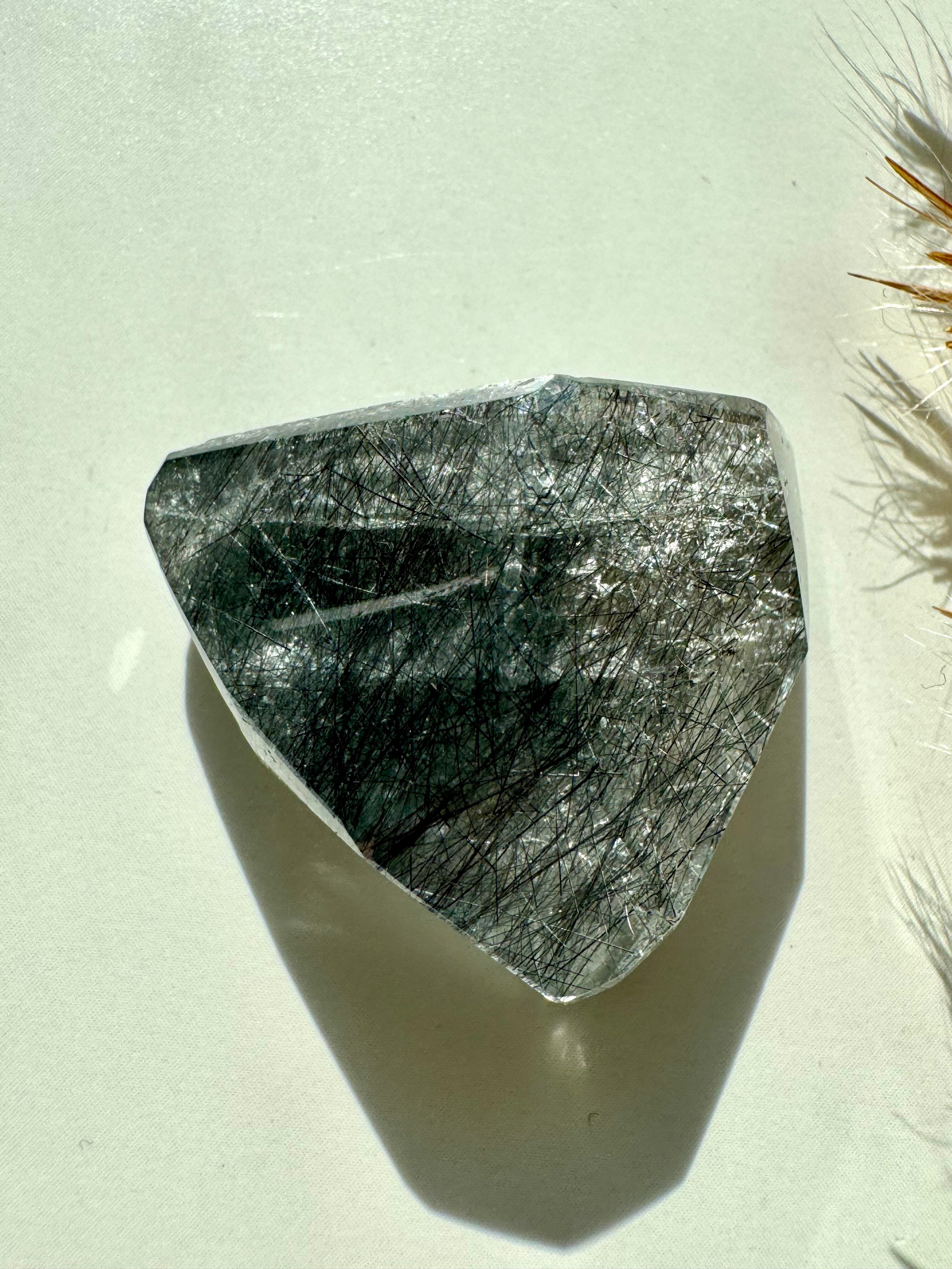 透明度の高い水晶にブルーブラックの内包物が綺麗に透けます。
