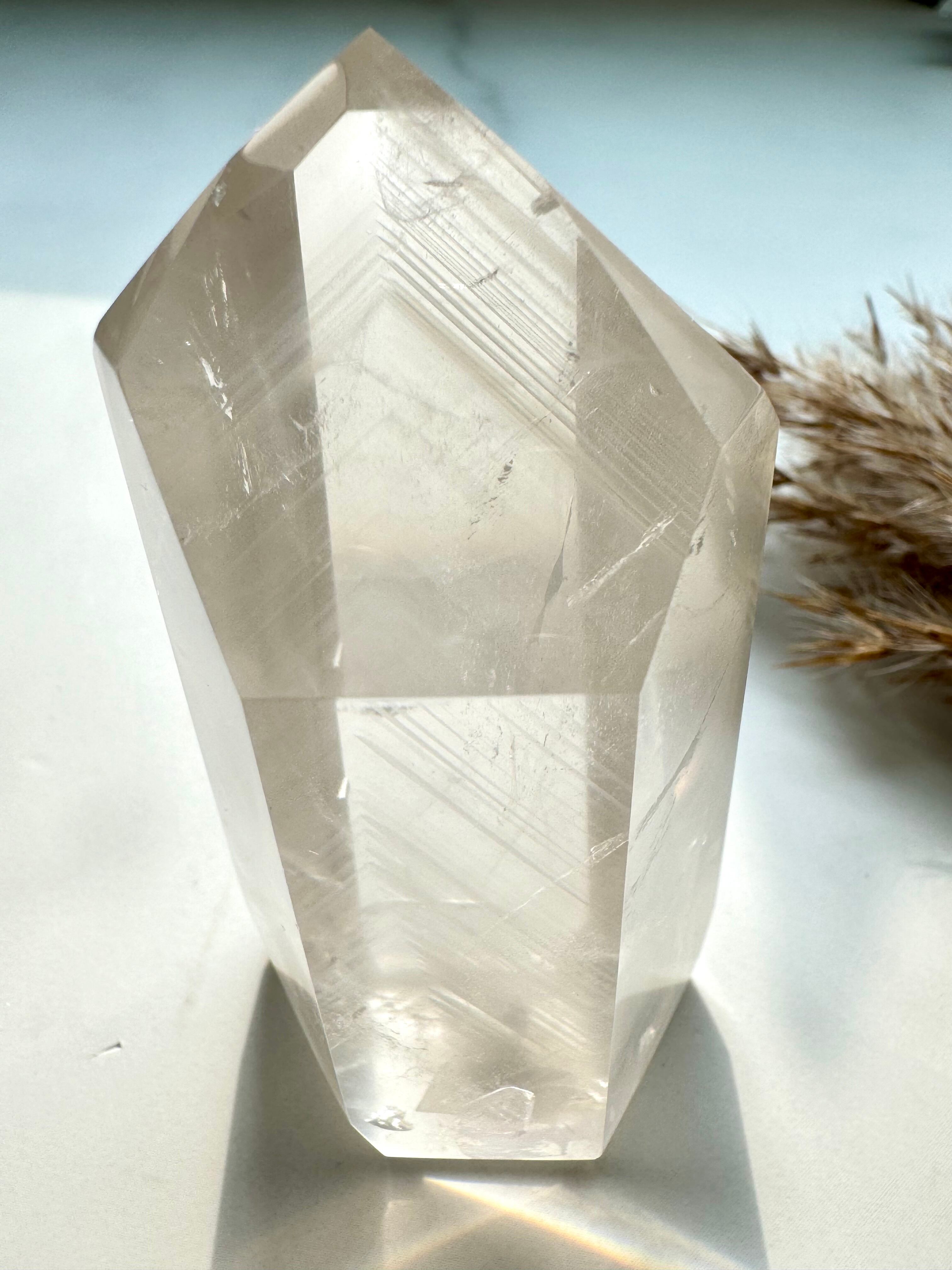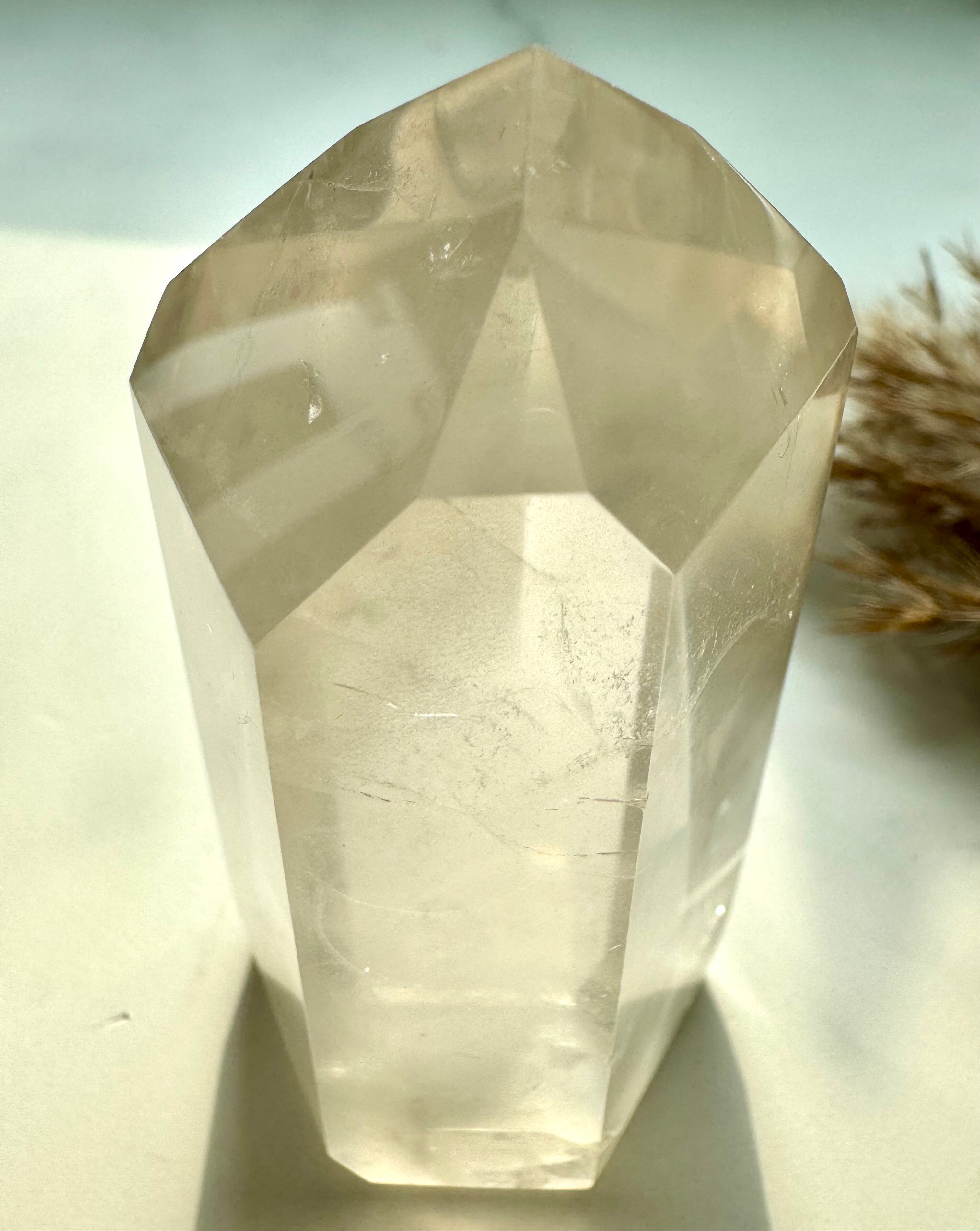 透明度の高いクォーツから見える優しい色合いが素敵なグレーファントムクォーツです。少しもブレずに優しく見守ってくれるファントムと虹がとても幻想的です。