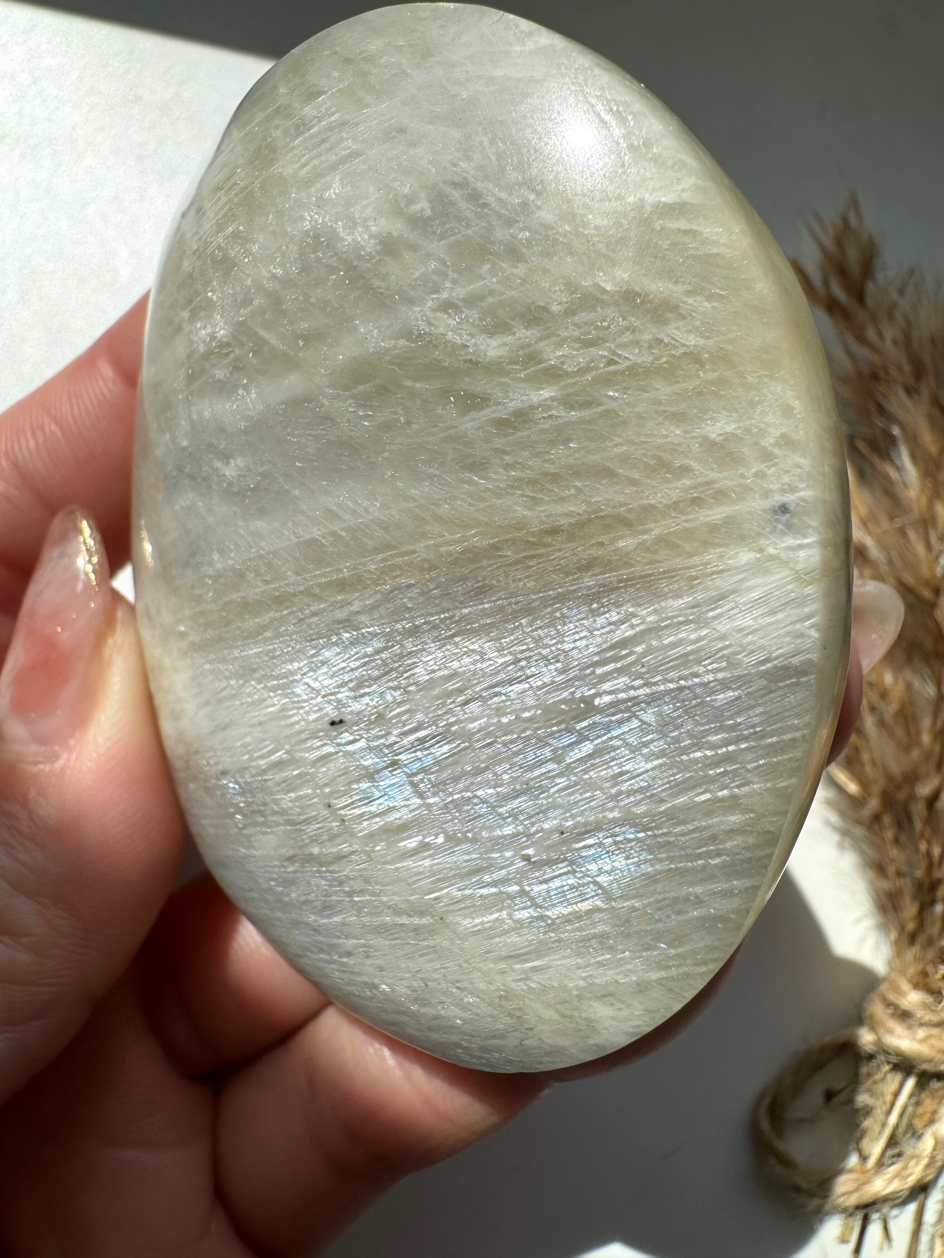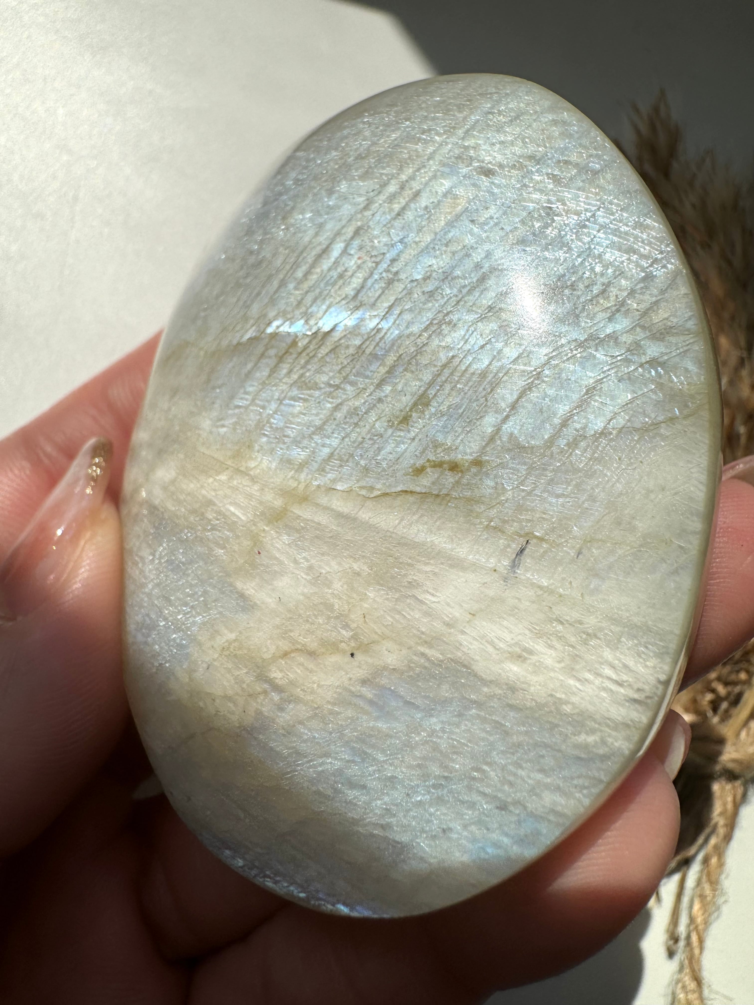 上品なブルーのシラーが美しい幻想的なムーンストーンのパームです。