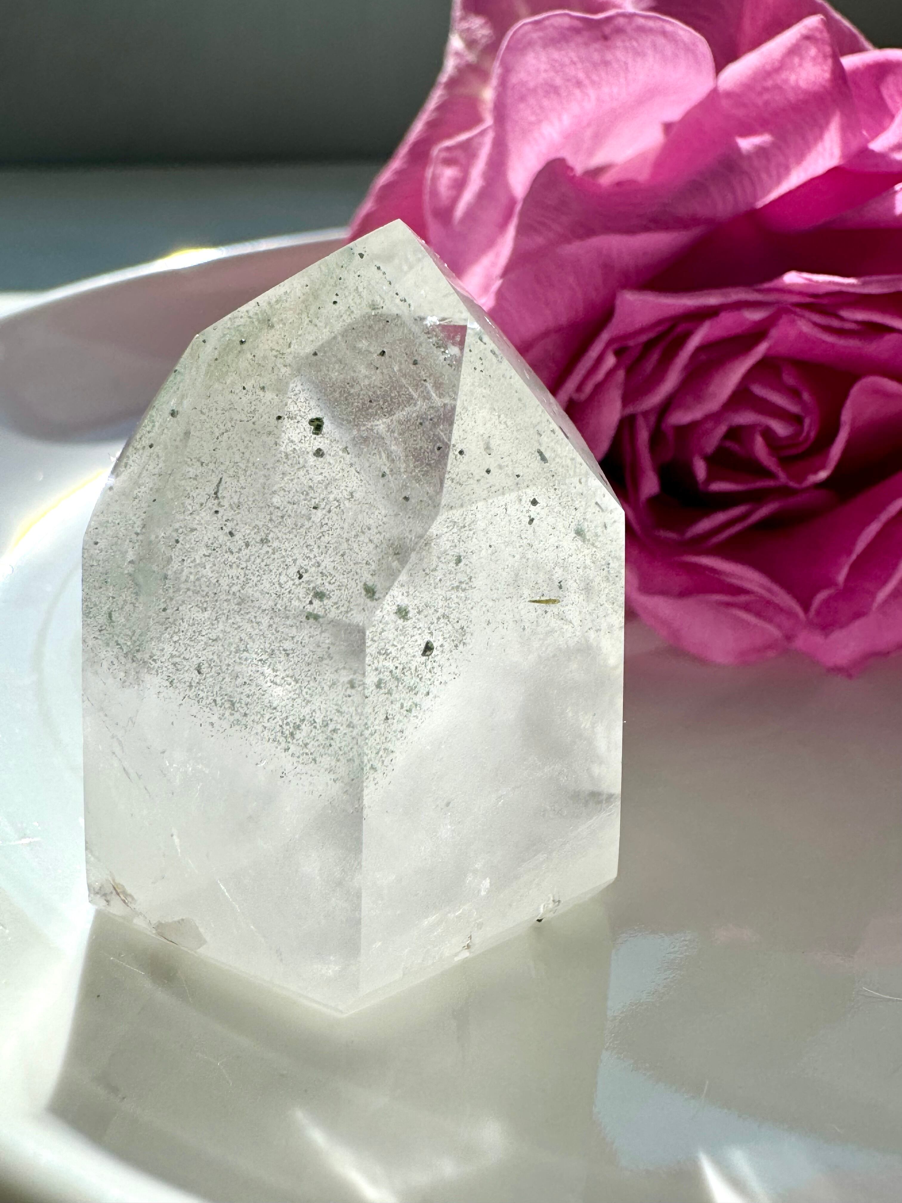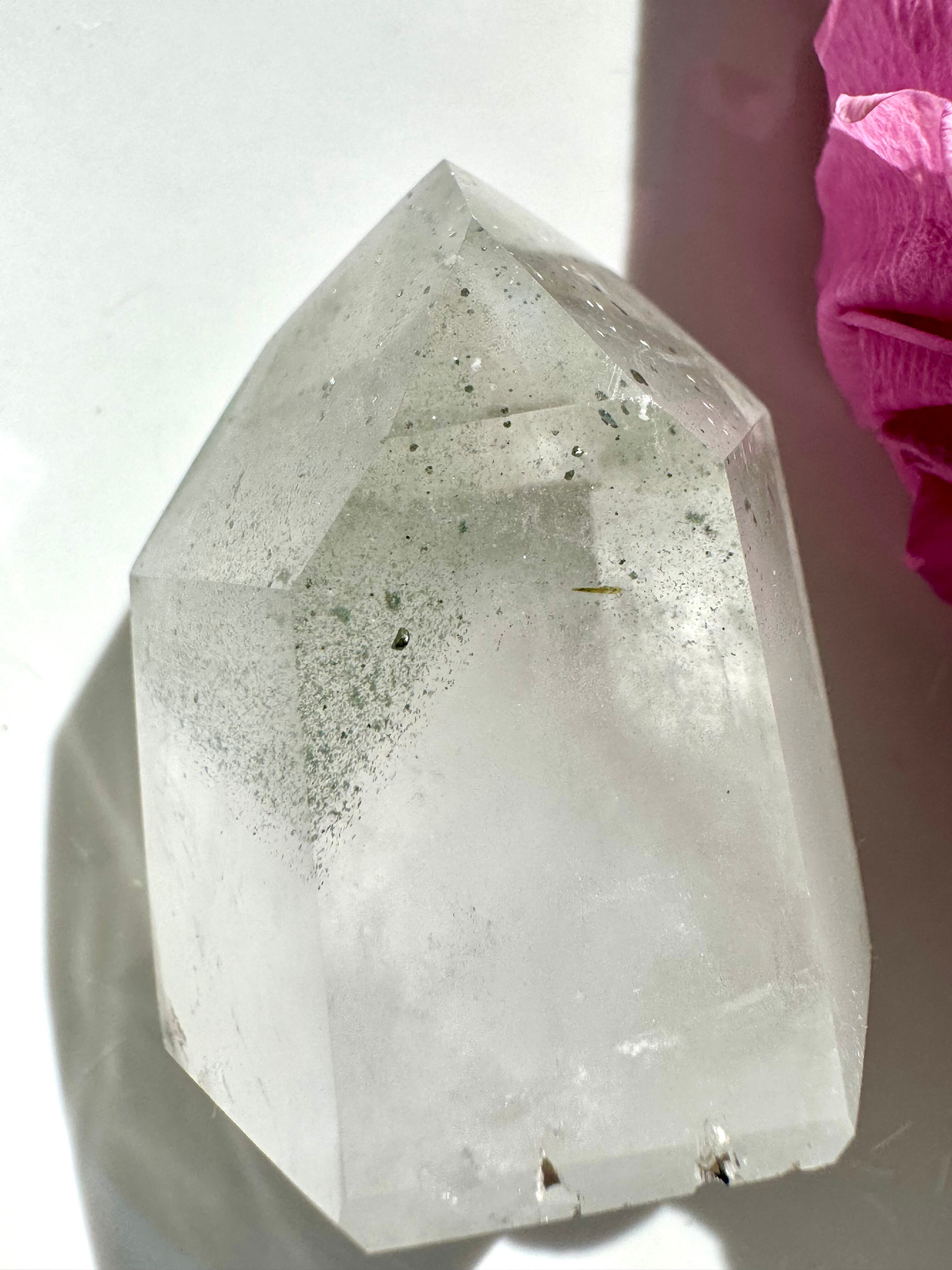 透明度の高いクォーツから見える幾重ものグリーンガーデンファントムとパイライトのファントムクォーツです。まるで春の山の様なグリーンが、静寂で洗練された世界を連想させる幻想的なポイントです。