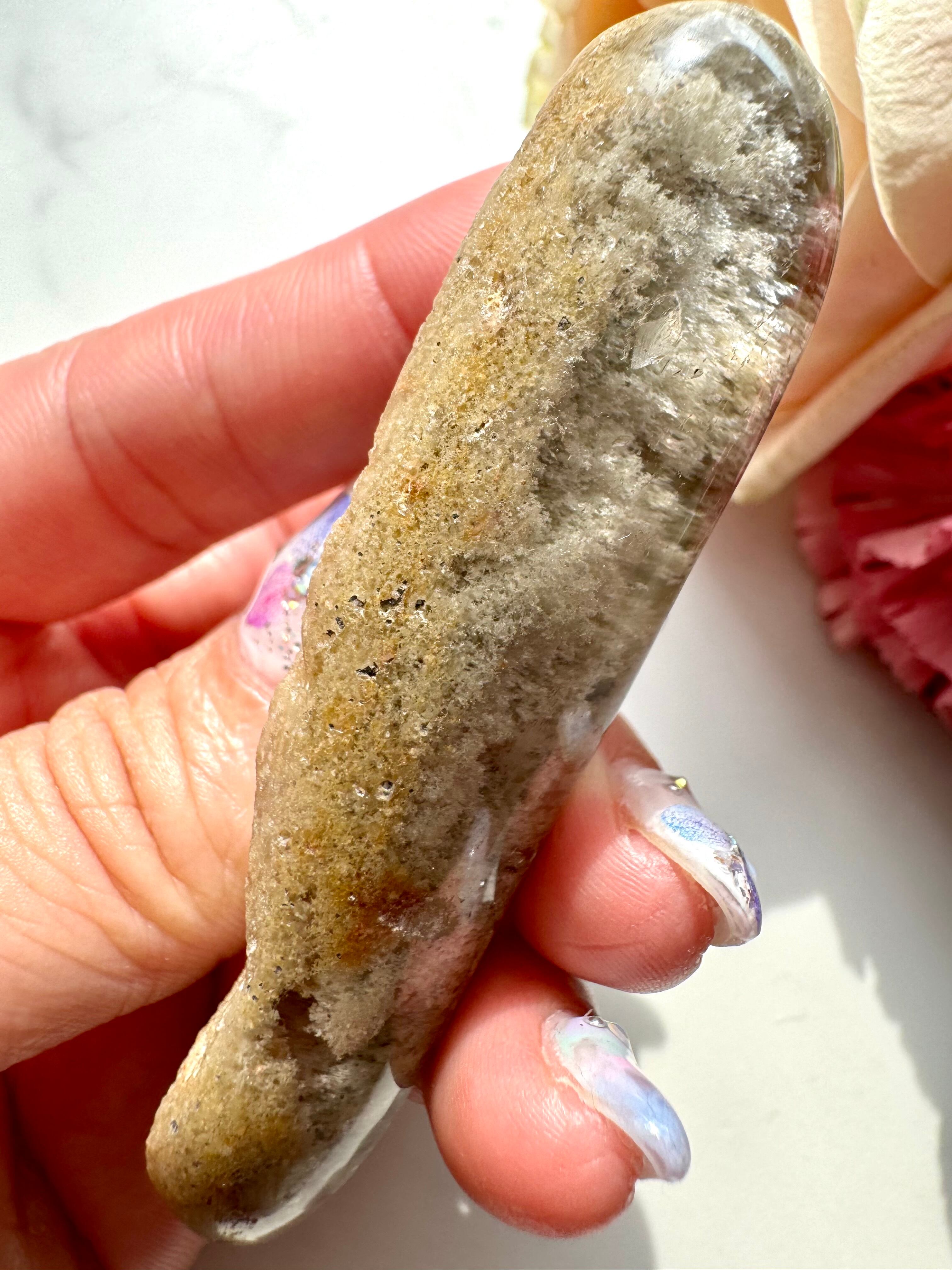 ガーデンクォーツは水晶が形成される過程で、緑や茶色の鉱物を巻き込みながら結晶した水晶です。水晶の中に自然の風景を閉じ込めらたように見えるため、「庭園水晶」や「苔入り水晶」とも呼ばれます。石の中に見える風景は実に様々で、内包物の状態や色によって、山や川、野原や森林などを連想させてくれます。
