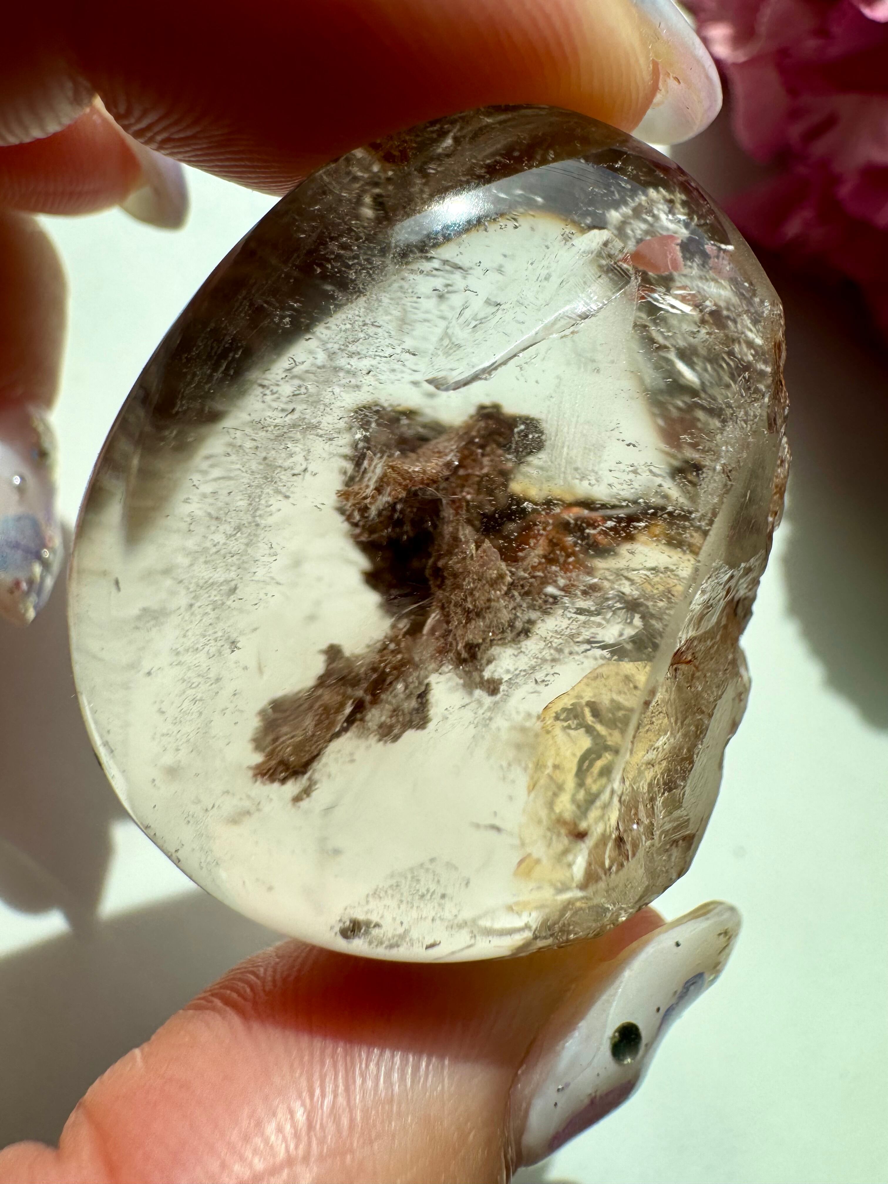 ガーデンクォーツは水晶が形成される過程で、緑や茶色の鉱物を巻き込みながら結晶した水晶です。水晶の中に自然の風景を閉じ込めらたように見えるため、「庭園水晶」や「苔入り水晶」とも呼ばれます。石の中に見える風景は実に様々で、内包物の状態や色によって、山や川、野原や森林などを連想させてくれます。