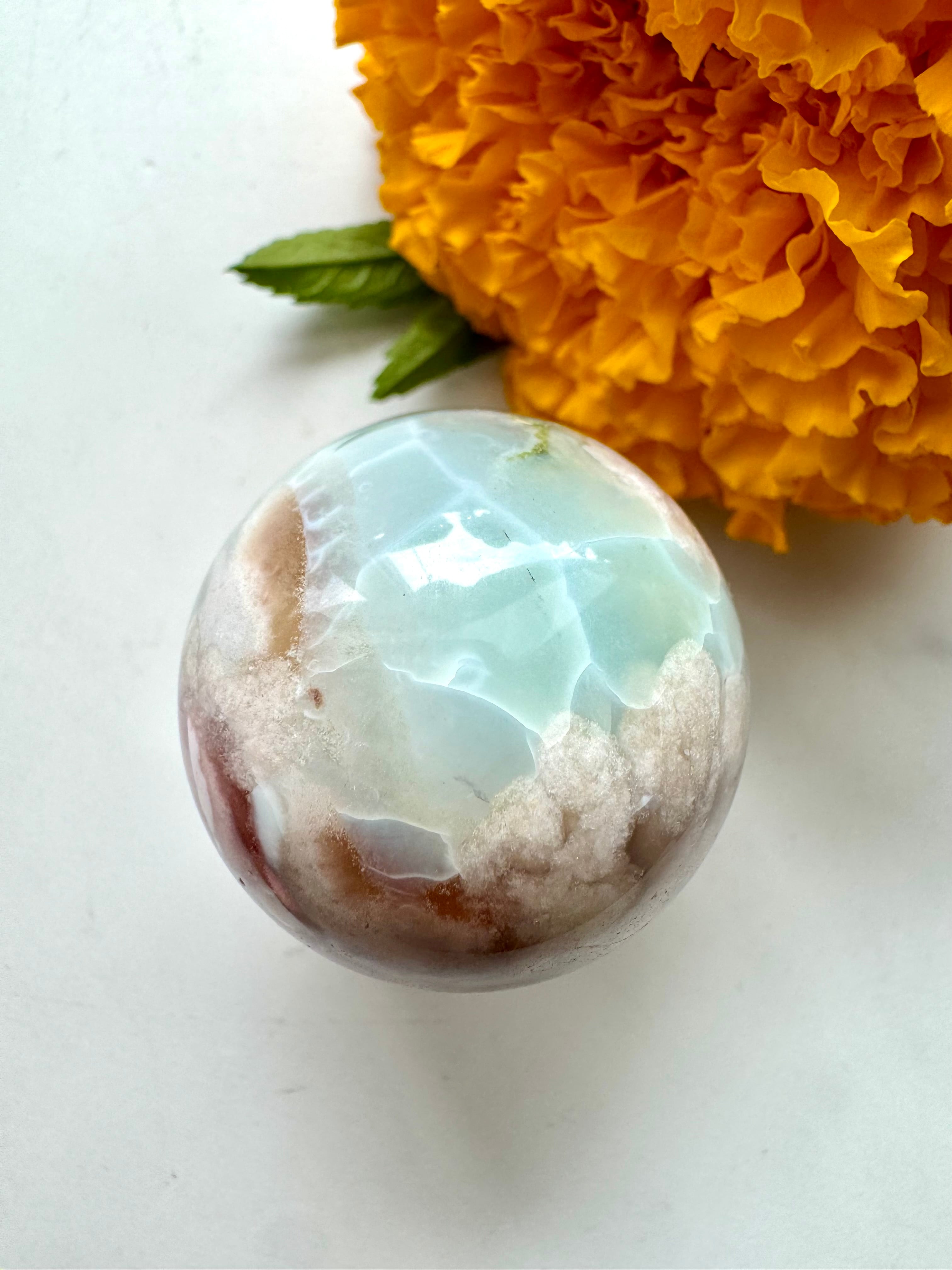 エメラルドグリーンの石に白いお花が咲いているとっても可愛らしいグリーンフラワーアゲートのスフィアです。握り石や、お気に入りのアロマオイルをほんの少し馴染ませたり瞑想時に使用すると心が落ち着き、癒しを得ることができます。
