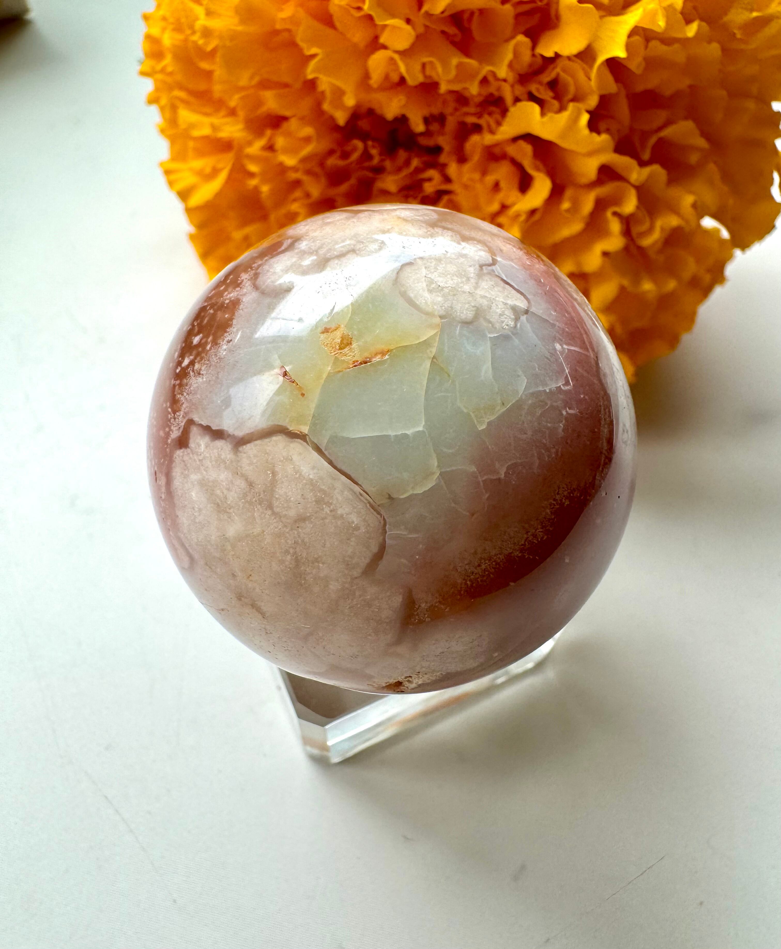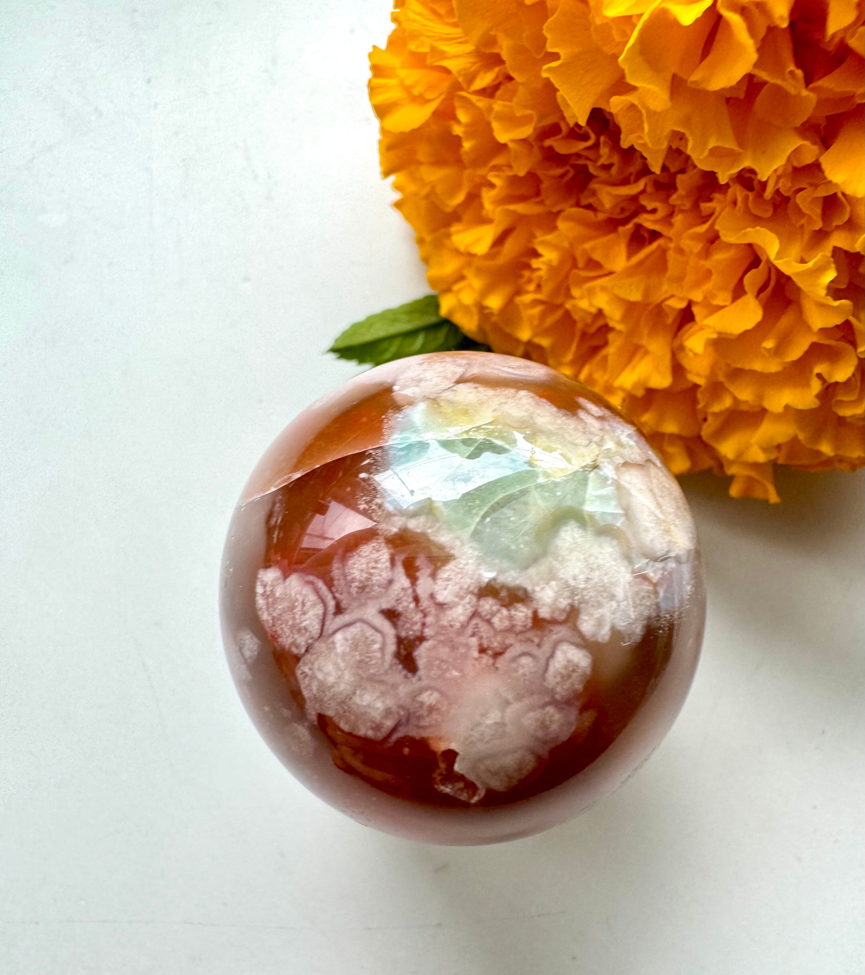 エメラルドグリーンも見られる優しいレッドの石に白いお花が咲いているとっても可愛らしいフラワーアゲートのスフィアです。握り石や、お気に入りのアロマオイルをほんの少し馴染ませたり瞑想時に使用すると心が落ち着き、癒しを得ることができます。