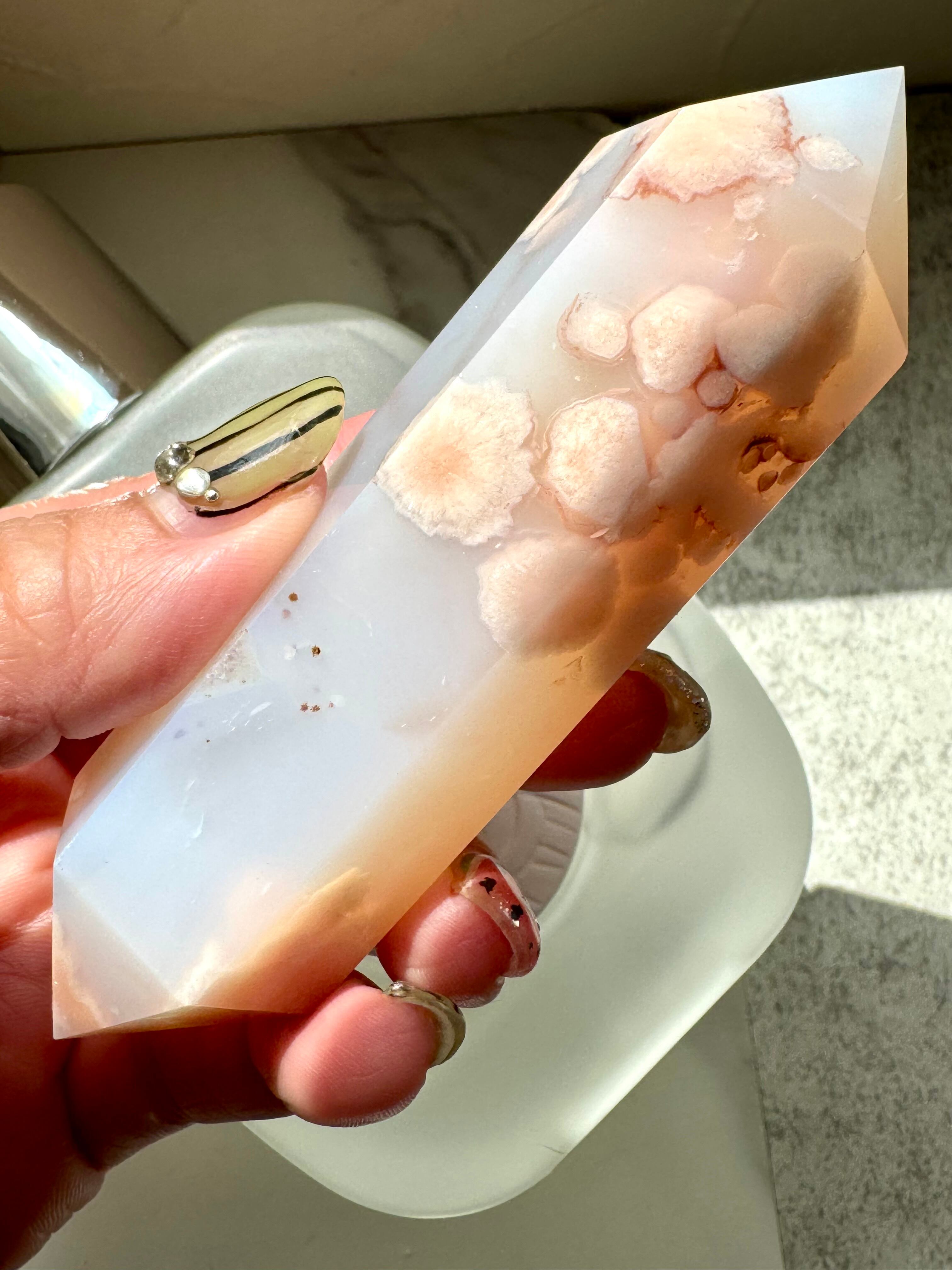 春の訪れを感じさせる桜を表現したような、フラワーアゲート(チェリーブロッサムアゲート)のダブルポイントです。半透明なホワイトの中に咲く桜が、心をときめかせます。