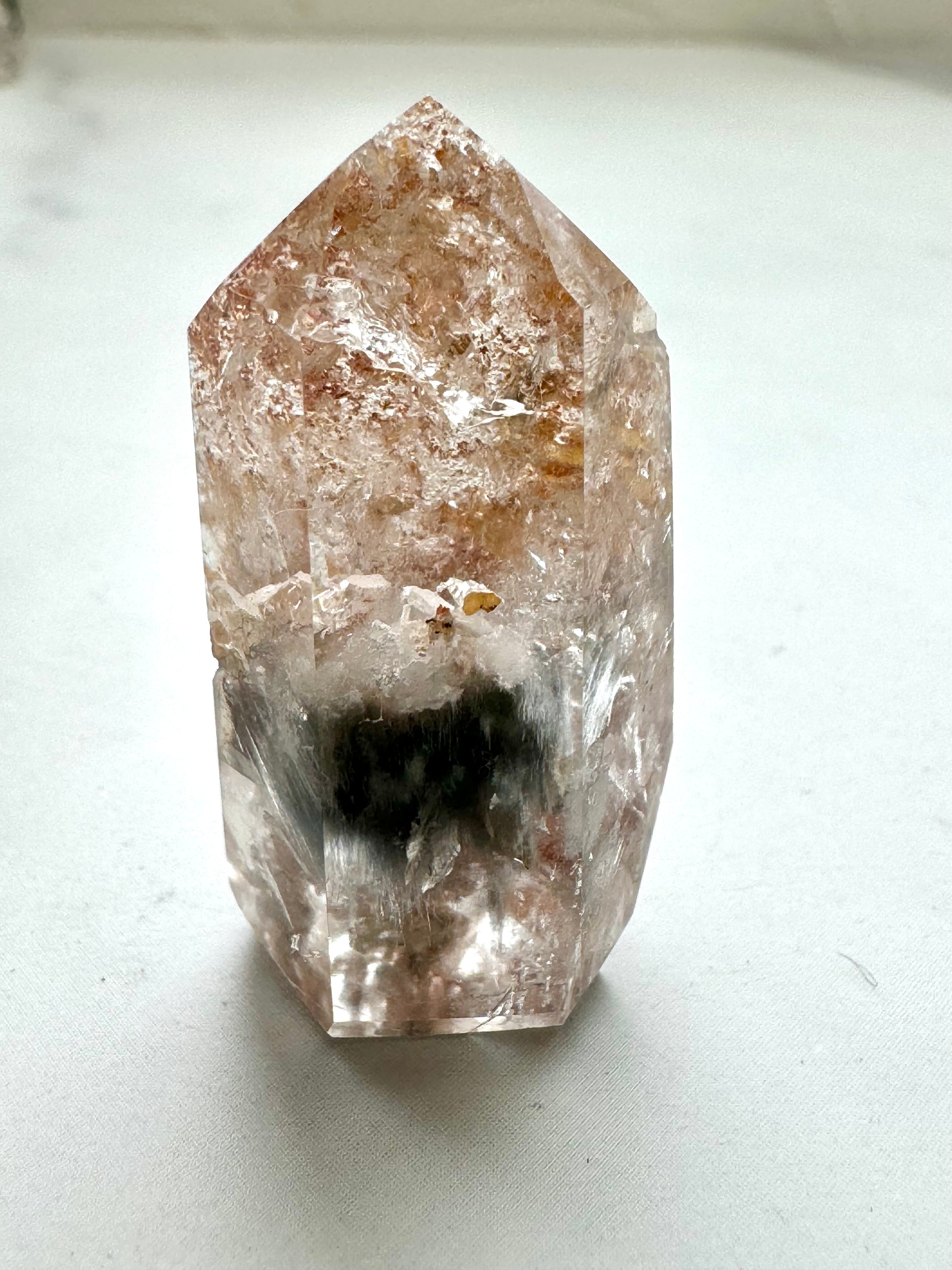 アンフィボールインクォーツは、内包されているアンフィボール(角閃石)によって羽のような、細い繊維のようなものが水晶の中に入っているように見えるクリスタルです。特に白色のものは、羽毛のような天使の翼のようなものにも見えることから、「エンジェルクォーツ」、「エンジェルファントムクォーツ」の名前で呼ばれています。