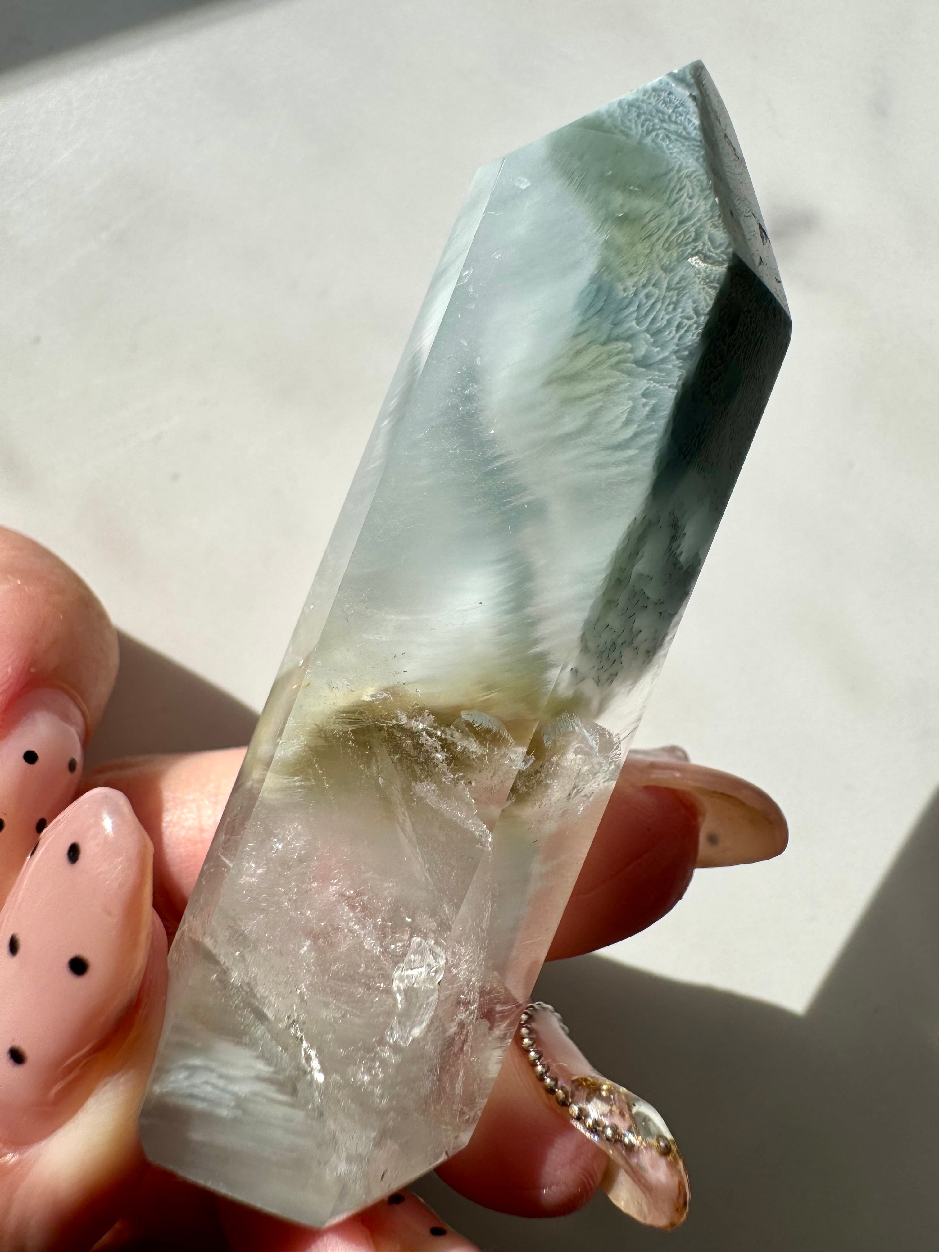 透明度の高い水晶に淡いブルーの内包物が綺麗に透けます。