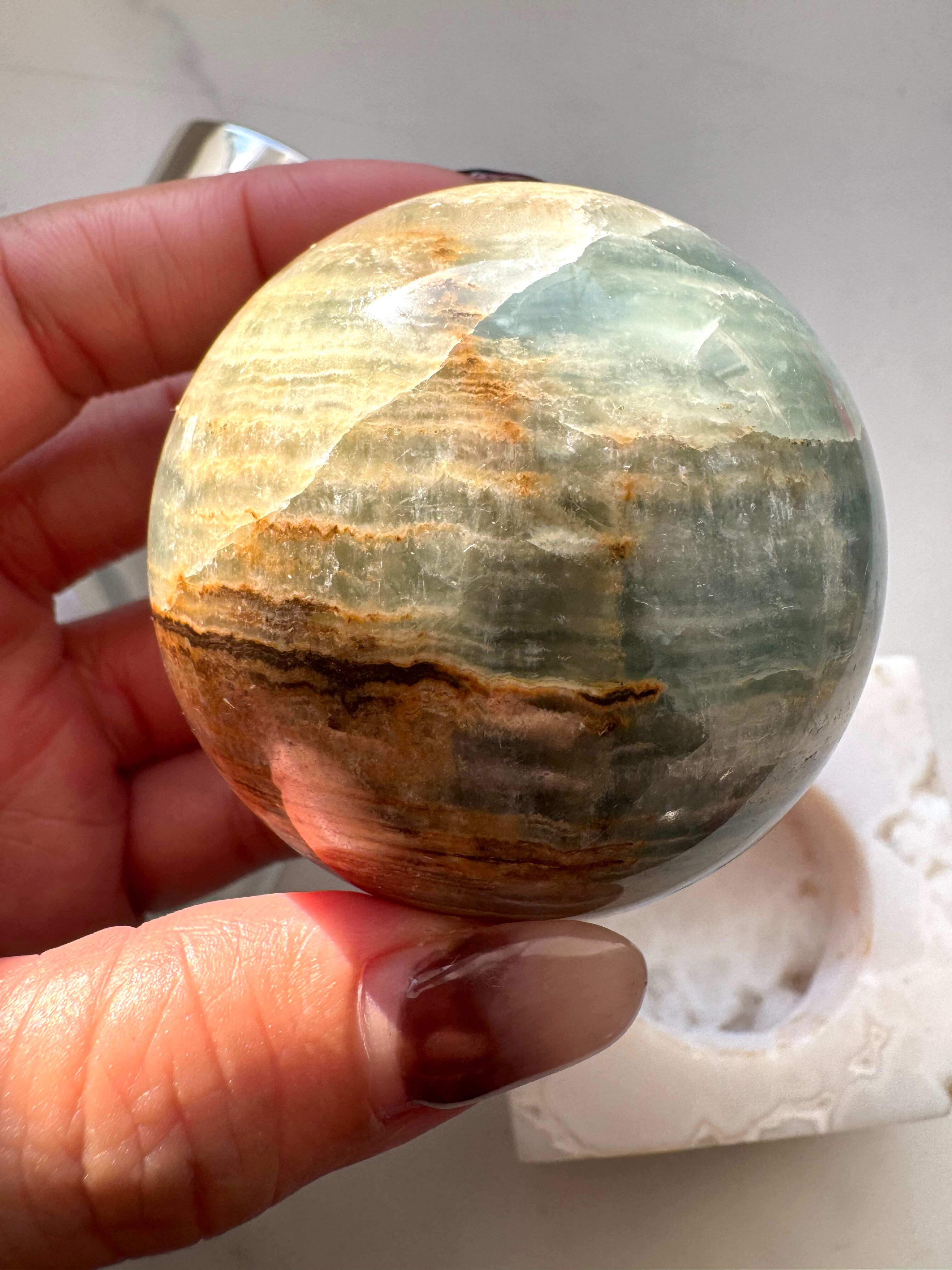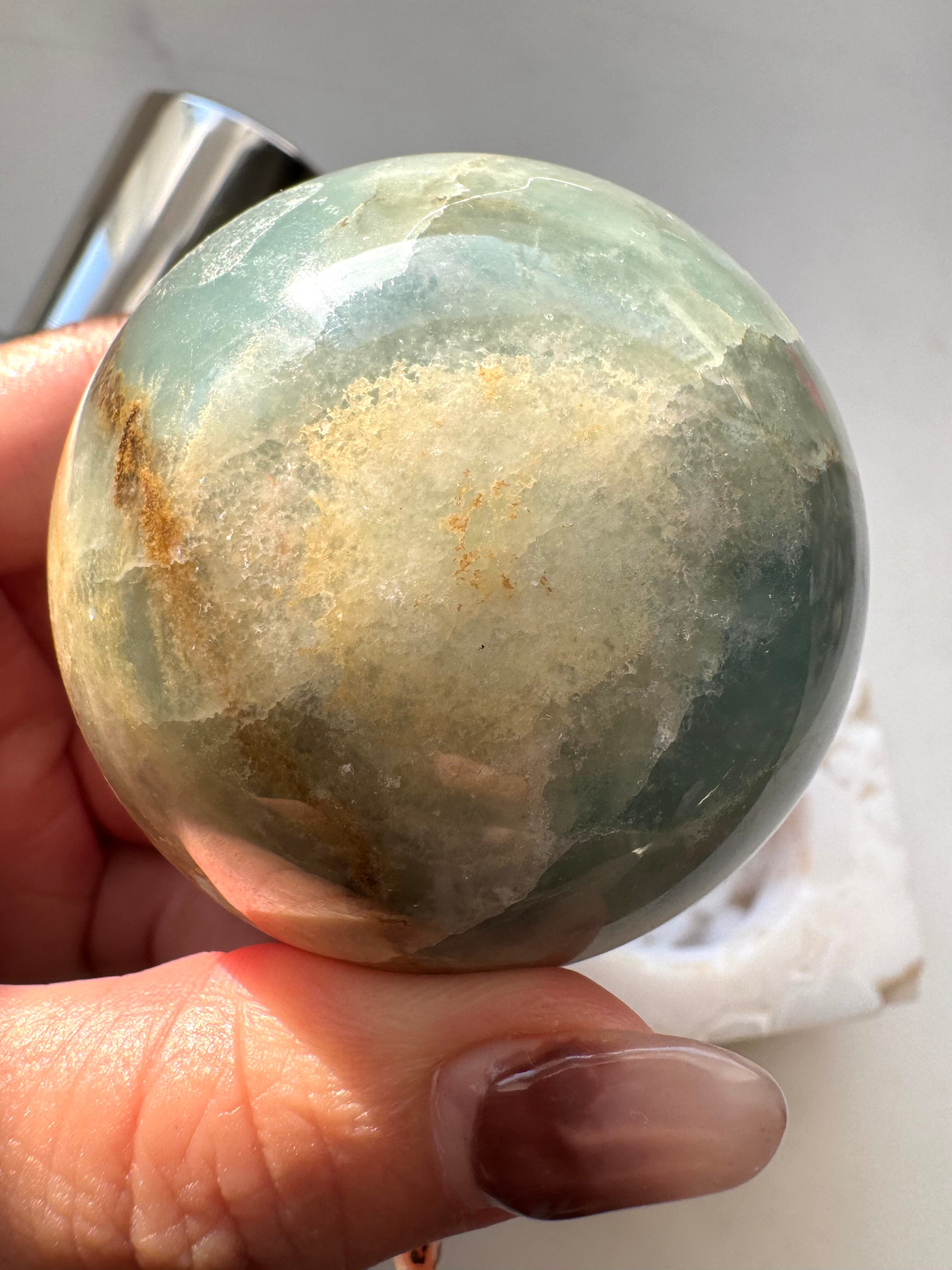 ブルーとグリーンを混ぜたようなカラーと、縞模様が美しい、レムリアンアクアティンカルサイトのスフィアです。クリアスタンドをお付けします。