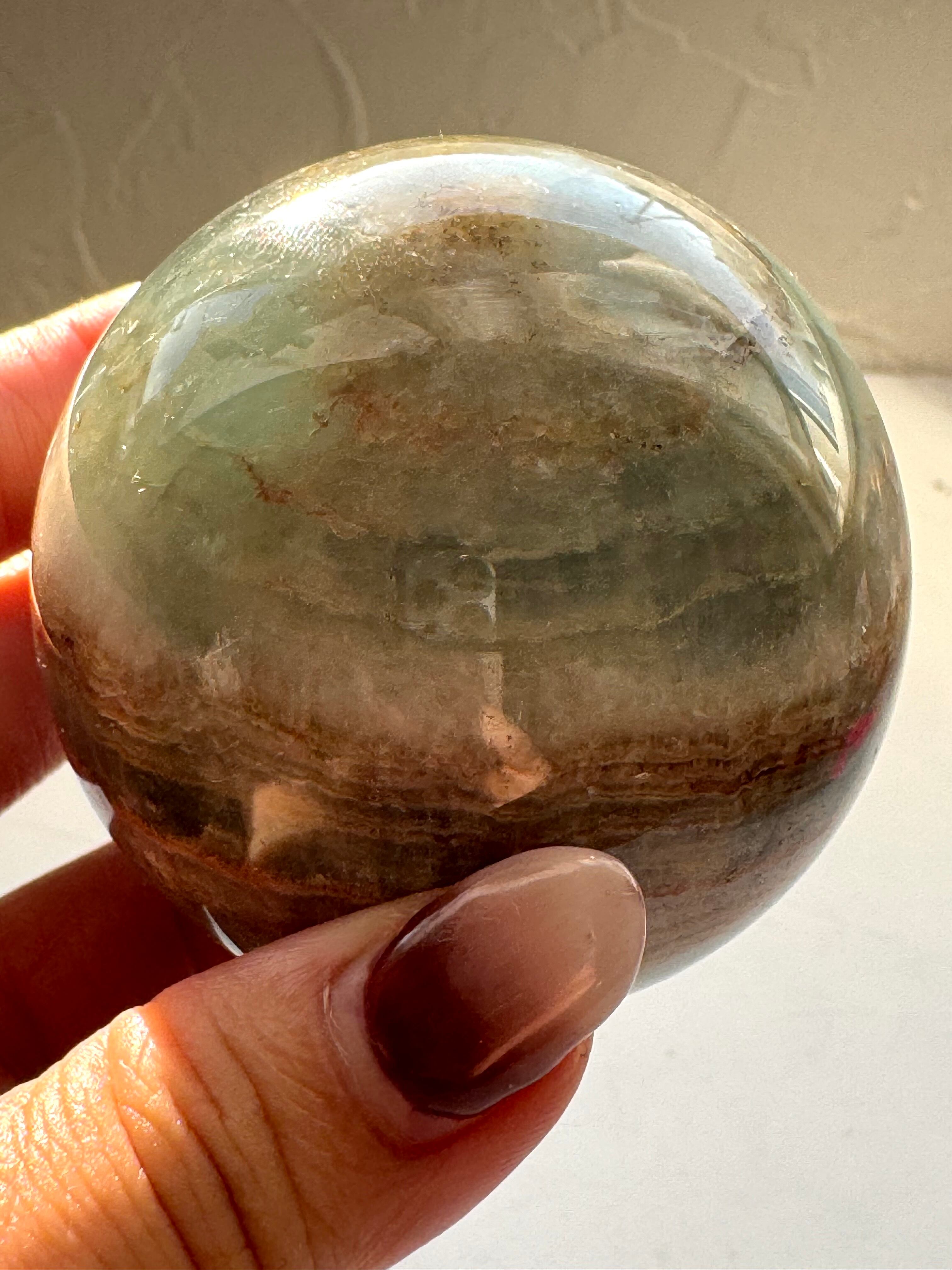 ブルーとグリーンを混ぜたようなカラーと、縞模様が美しい、レムリアンアクアティンカルサイトのスフィアです。クリアスタンドをお付けします。