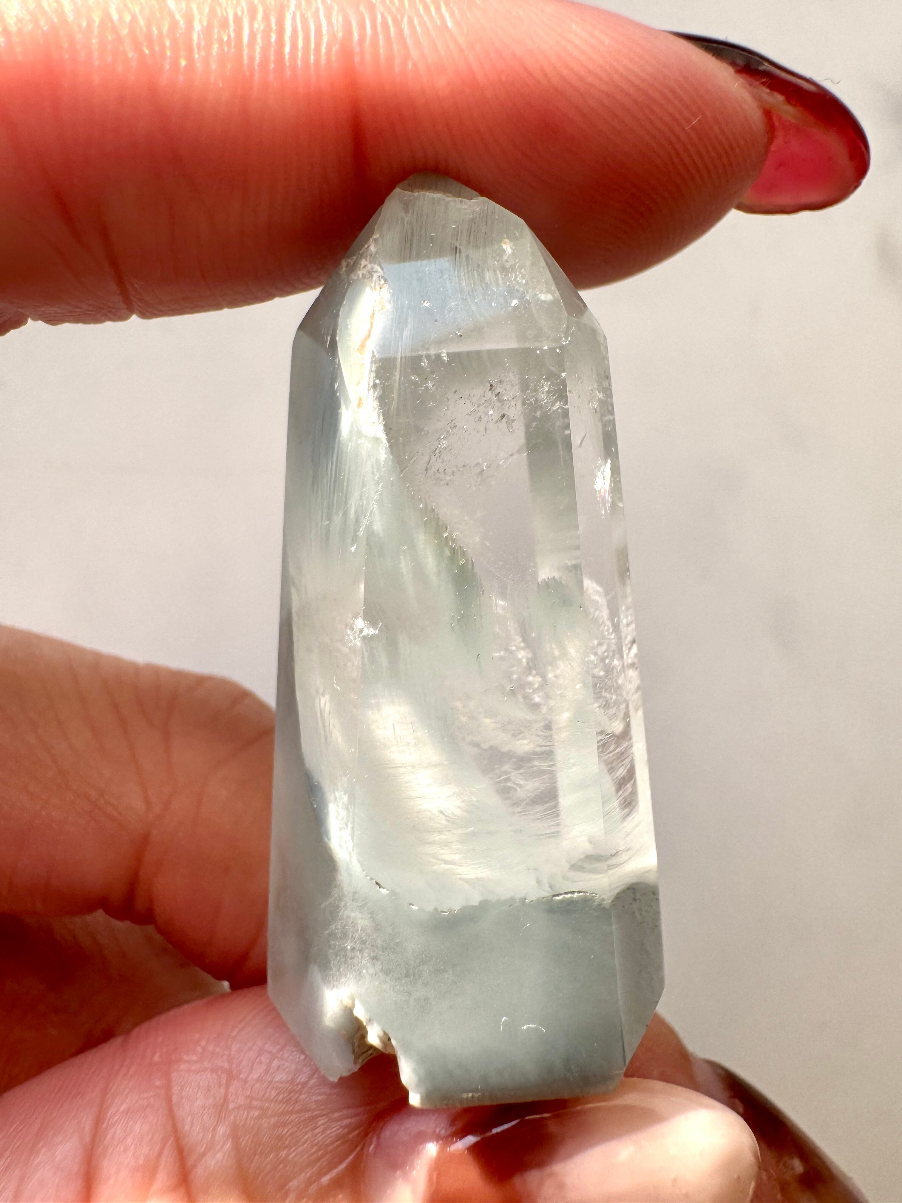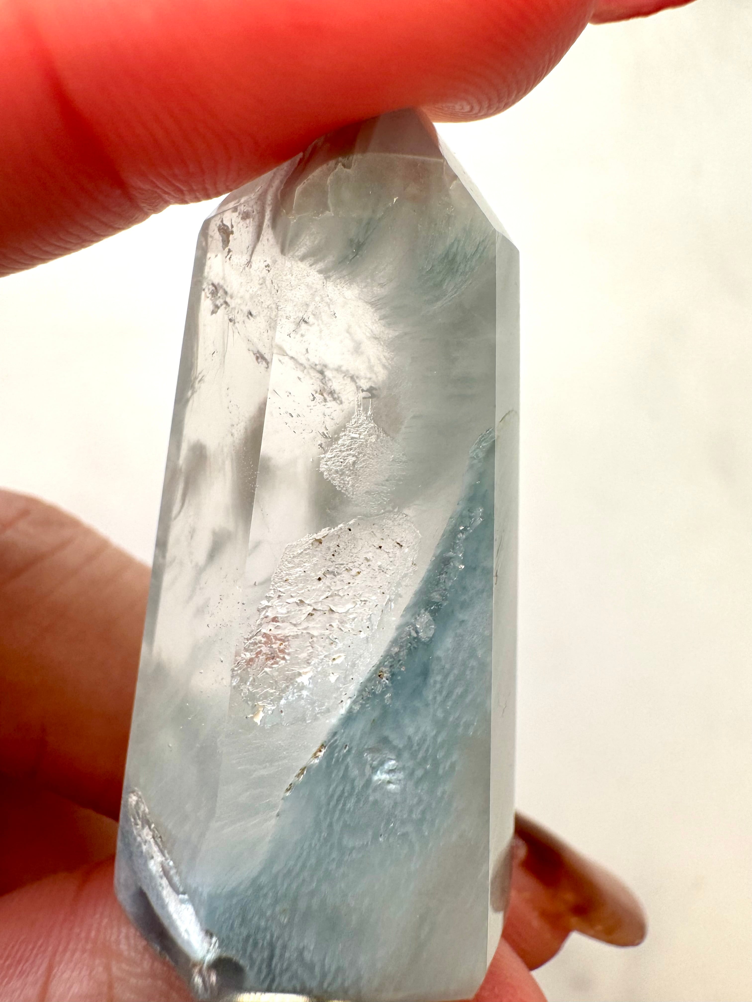 透明度の高い水晶に淡いブルーの内包物が綺麗に透けます。