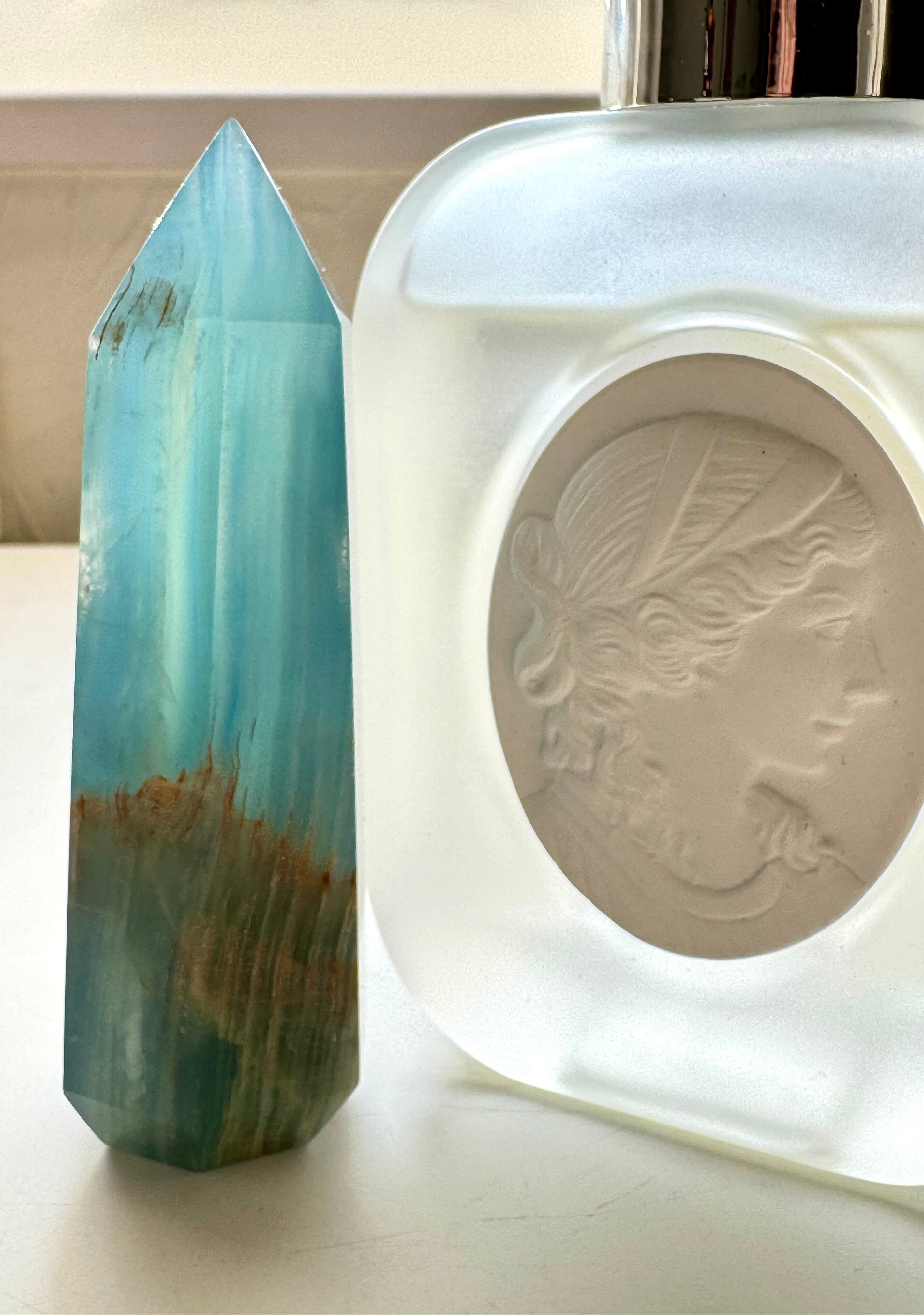 ブルーとグリーンを混ぜたようなカラーと、縞模様が美しい、レムリアンアクアティンカルサイトのタワーです。